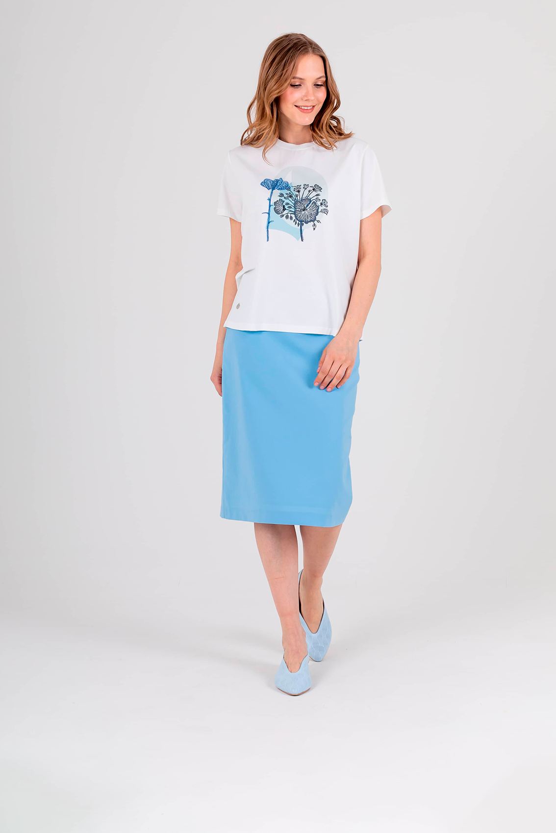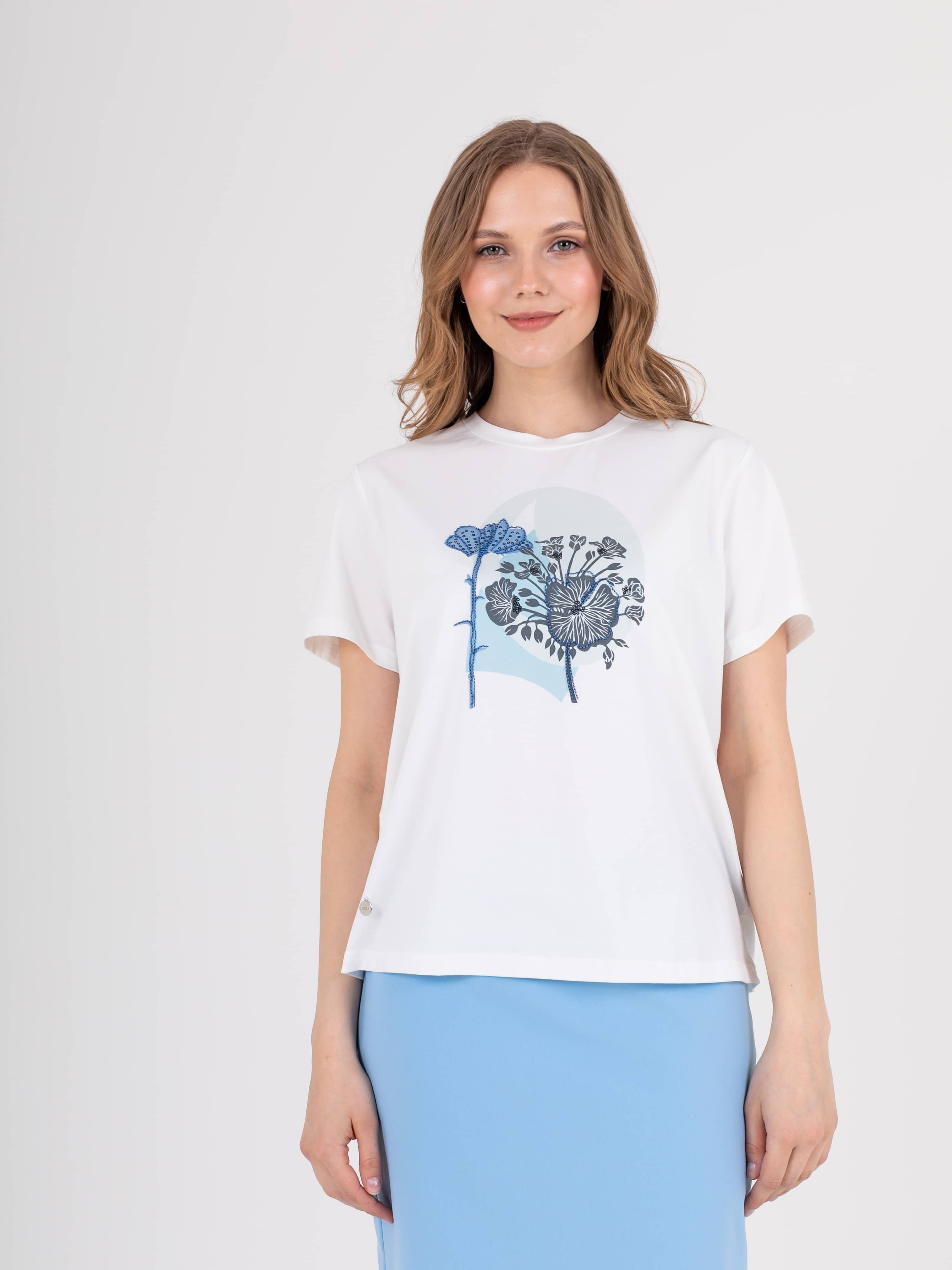 Футболка средней длины прямого силуэта из легкого хлопка с добавлением спандекса. По переду выполнен нежный растительный принт с вышивкой. Укороченные втачные рукава. Круглый вырез горловины.