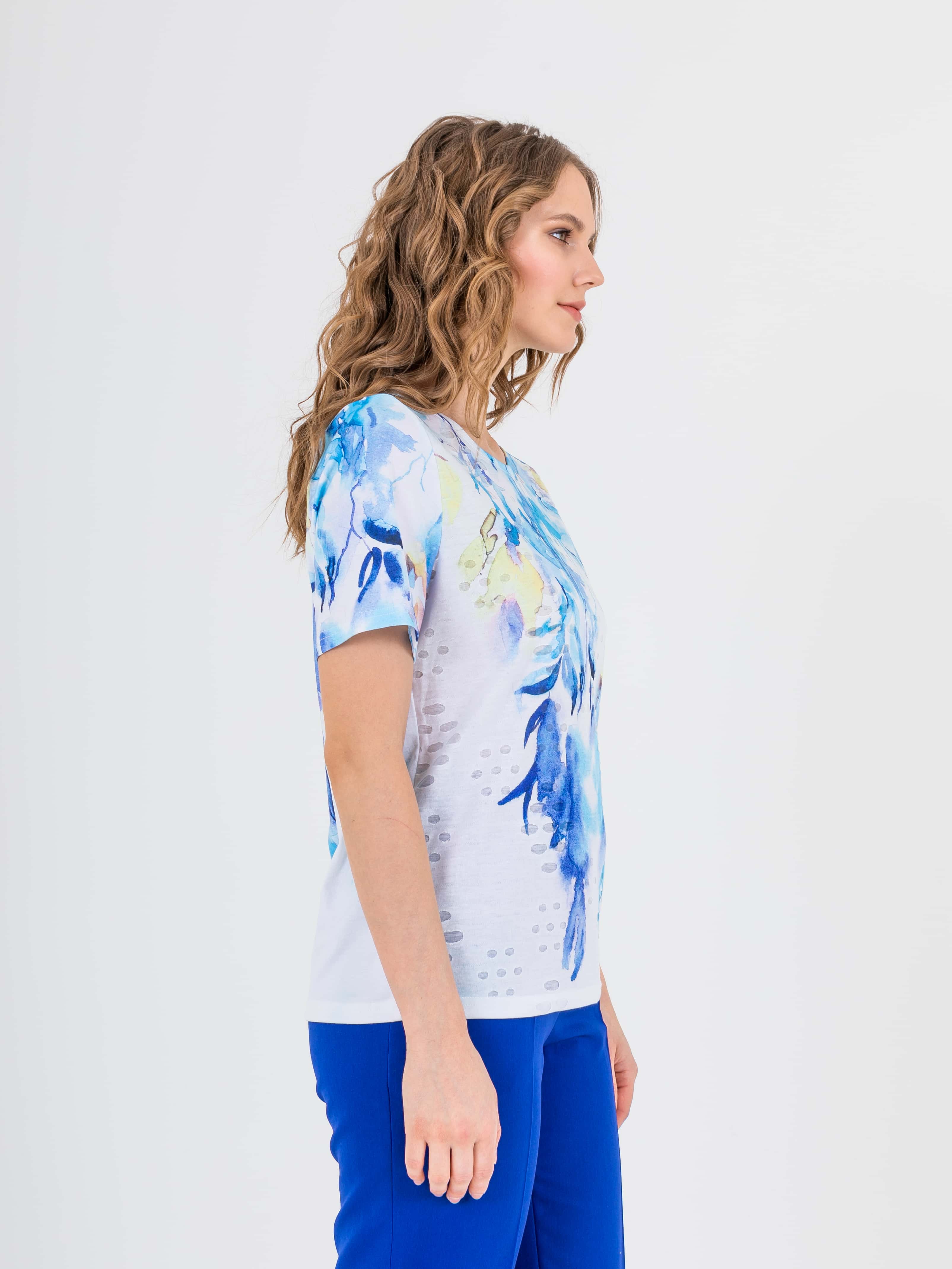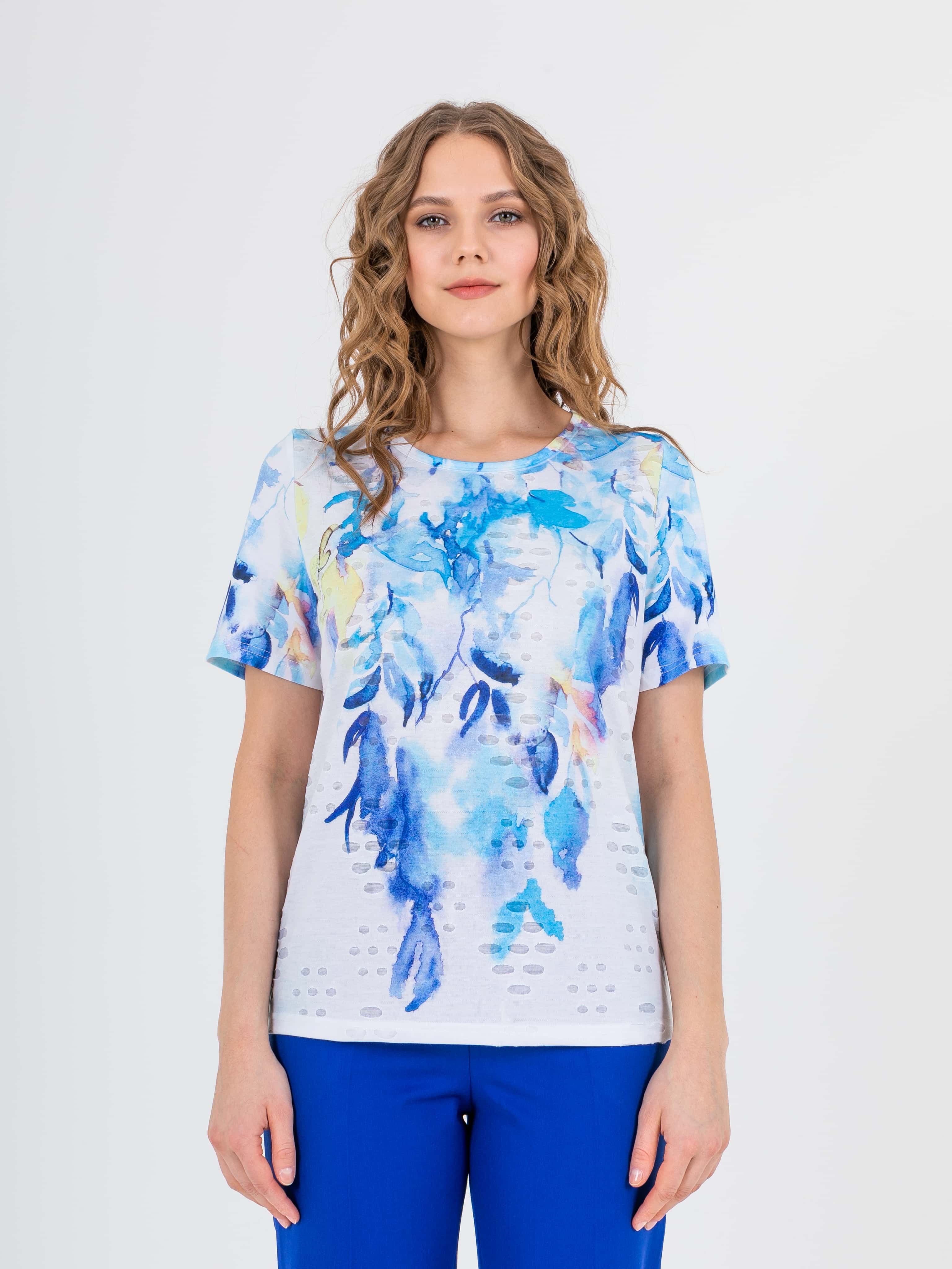 Футболка средней длины прямого силуэта из полиэстера с добавлением эластана, дизайнерская особенность модели – нежный растительный принт. Перед выполнен из фактурного трикотажа. Укороченные втачные рукава. Круглый вырез горловины.