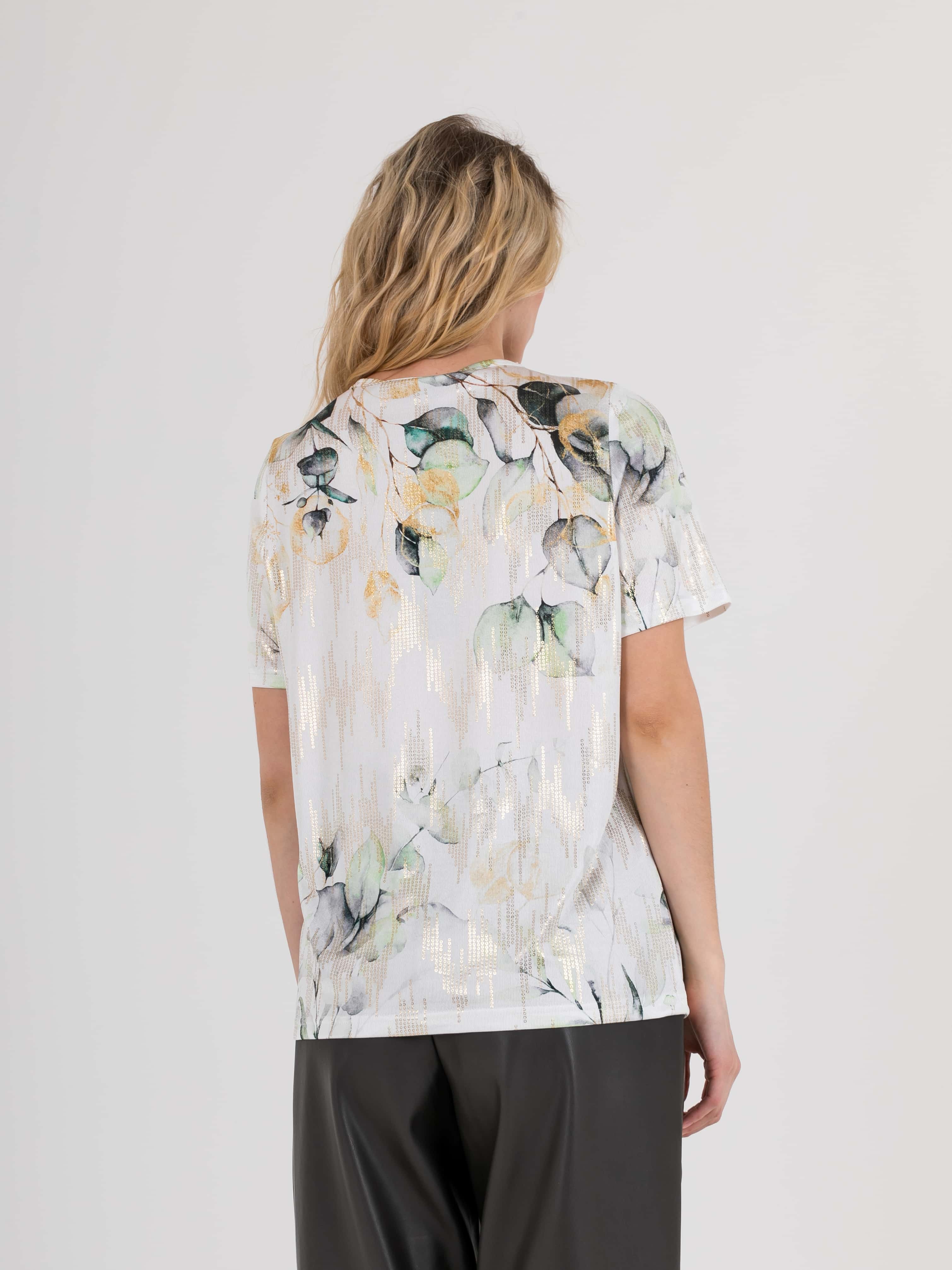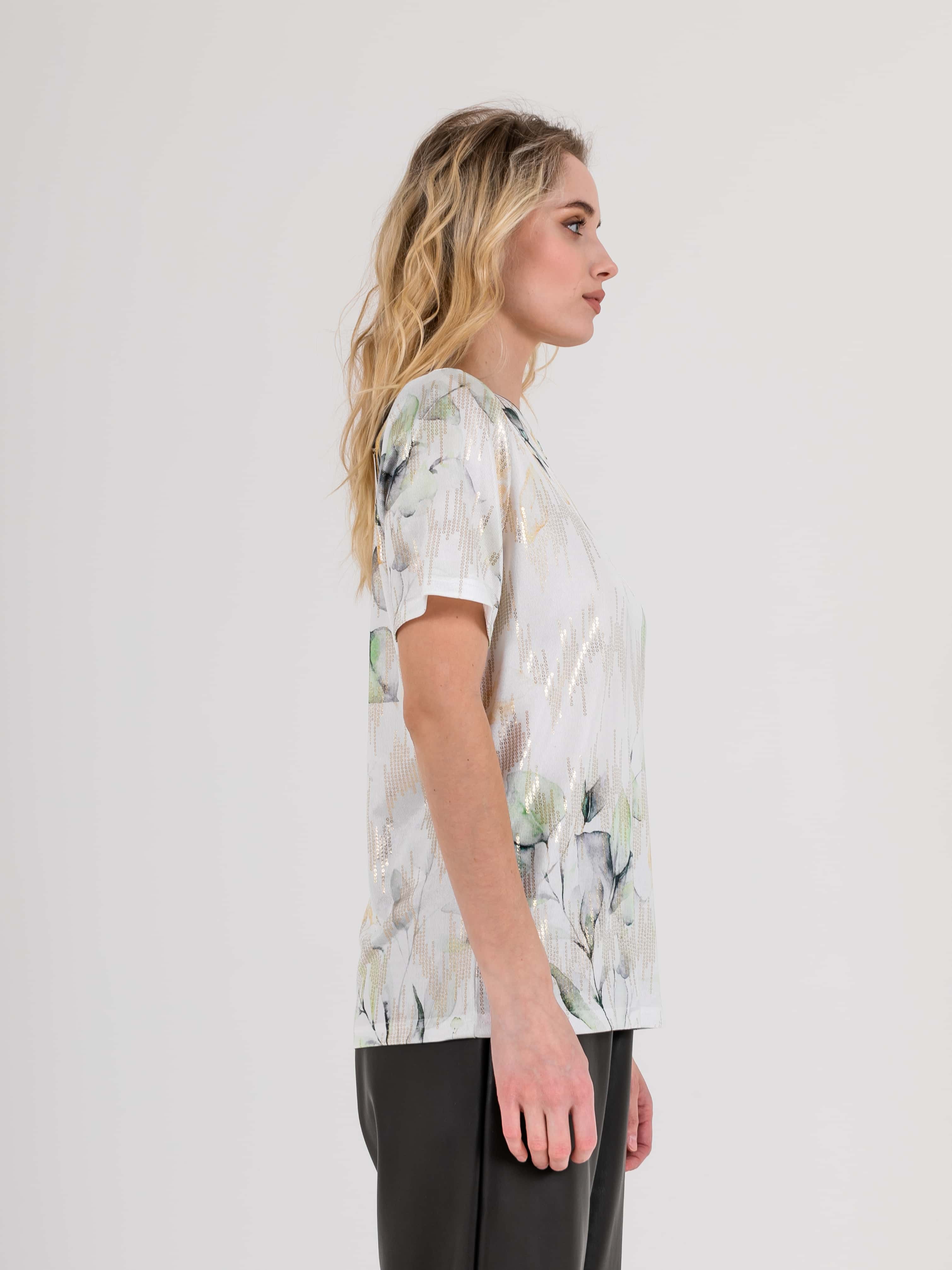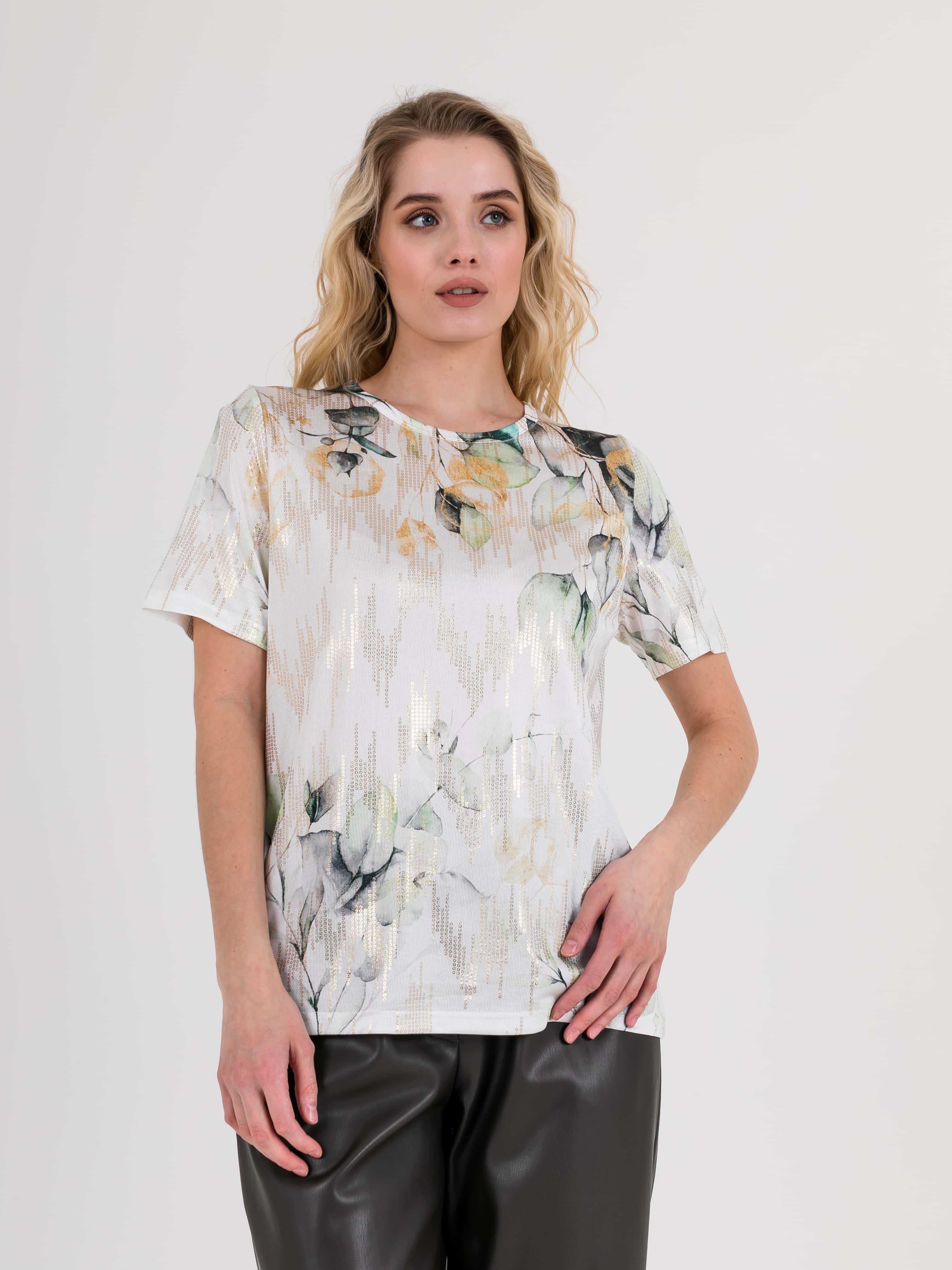 Футболка средней длины прямого силуэта из полиэстера с добавлением эластана, дизайнерская особенность модели –нежный растительный принт с имитацией пайеток. Укороченные втачные рукава. Круглый вырез горловины.