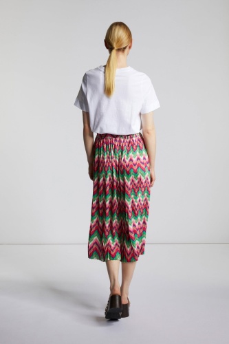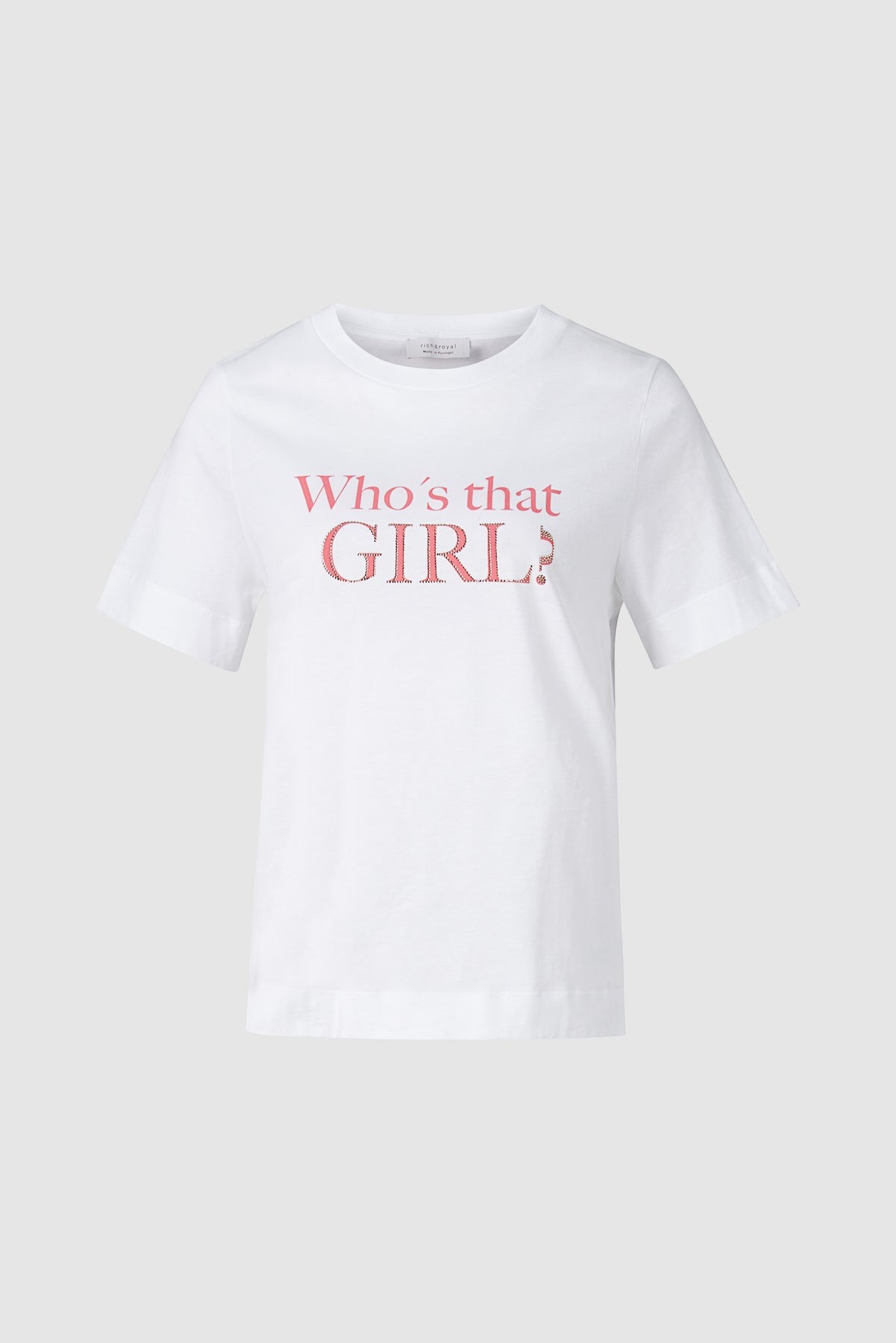 Привлекательным элементом этой футболки из органического хлопка является размещенный принт с надписью «Кто эта девушка». Это также обеспечивается каймой со стразами. В остальном свободный крой верха характерен для рубашки с круглым вырезом, рукавом в четверть и небольшими боковыми разрезами. Длина в размере 42: 61см