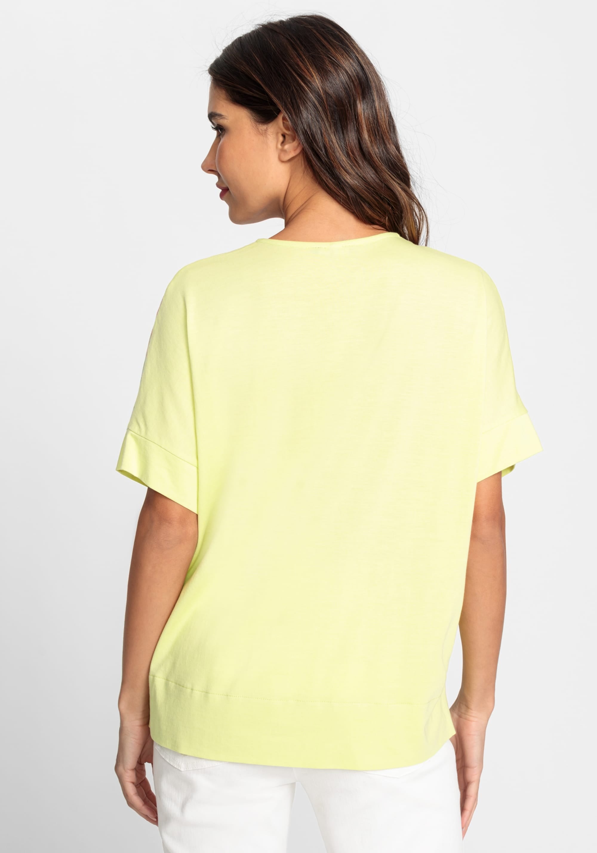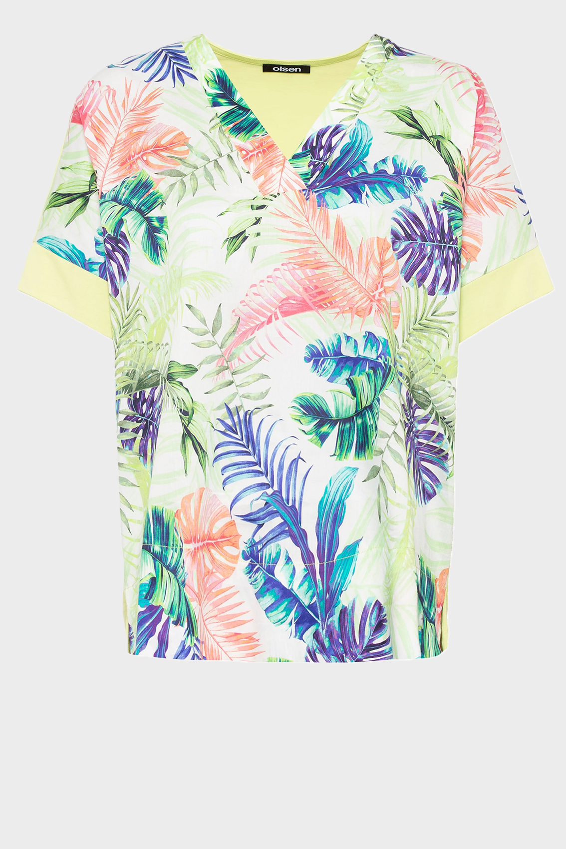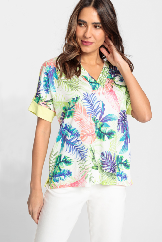 Тропический принт в ярких цветах украшает переднюю часть этой футболки. Вырез туники выполнен спереди из легкого тканого хлопка, а спинка и отделка выполнены из хлопкового трикотажа.