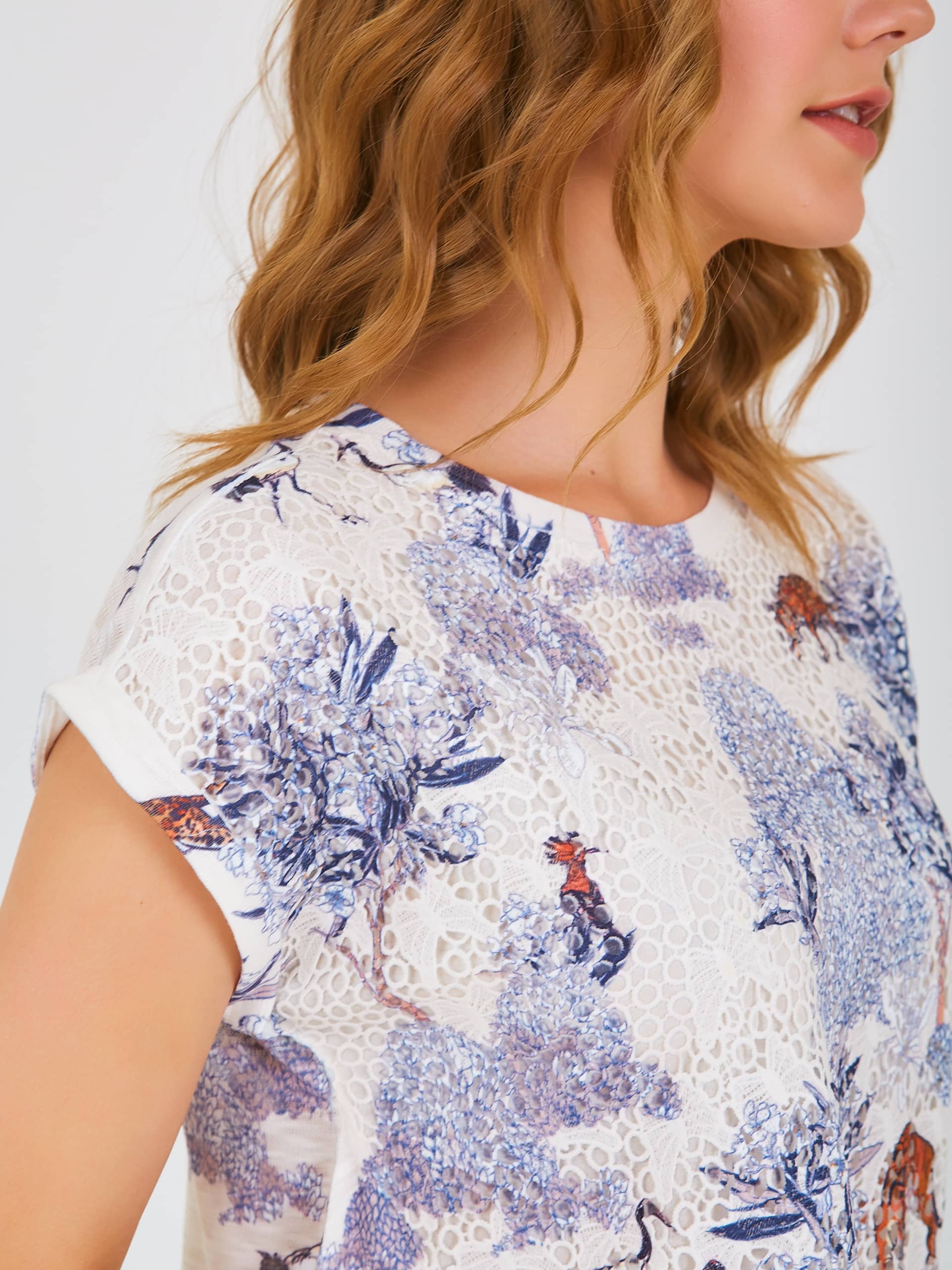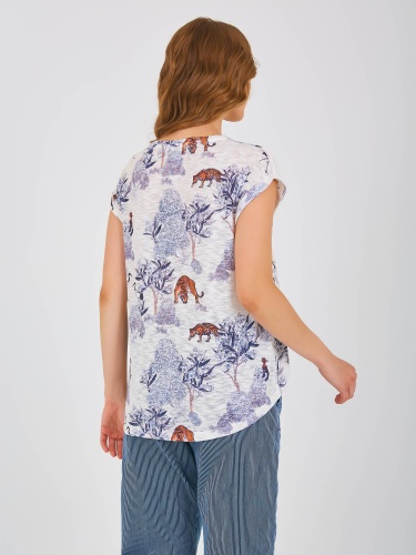 Двухслойная футболка средней длины прямого силуэта из полиэстера с добавлением мягкой вискозы, дизайнерская особенность модели – принт в восточном стиле и фактурный трикотаж. Перед выполнен из нежного шитья с бабочками и вставками из трикотажа. Короткие цельнокроеные рукава с манжетами. Круглый вырез горловины.