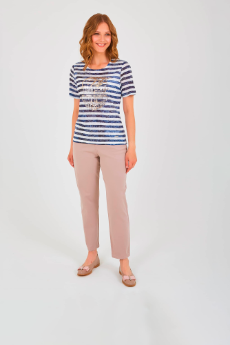 Футболка средней длины прямого силуэта из полиэстера с добавлением мягкой вискозы, дизайнерская особенность модели – принт в полоску и фактурный трикотаж. По переду выполнен яркий морской принт. Укороченные втачные рукава. Круглый вырез горловины.