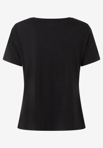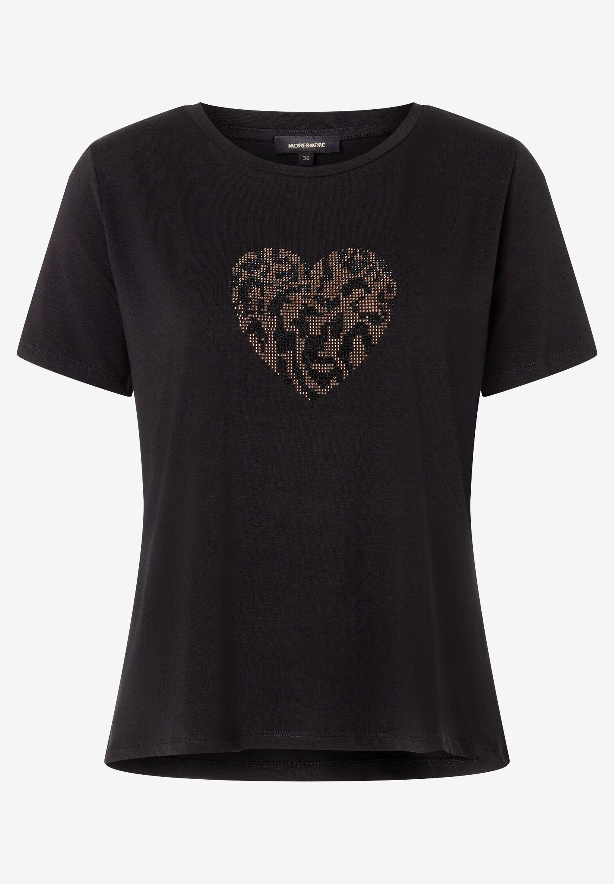 Привлекательная футболка MORE & MORE со сверкающим сердечком из стразов спереди привлекает внимание и одинаково хорошо смотрится с выцветшими джинсами, струящейся тюлевой юбкой или классическими деловыми брюками. Gрямая, свободная форма. круглый вырез и короткие рукава. Сзади немного длиннее, чем спереди. Длина по размеру 42 = 60 см