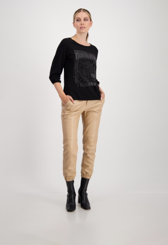 Мягкая на ощупь и оптимальная посадка, рубашка с рукавом 3/4 удобна в ношении. Она декорирована леопардовым узором в тон с надписью блестками. Круглый вырез горловины со швом из блестящего люрекса. Подол рукава на резинке. Длина 44 размера 62 см.