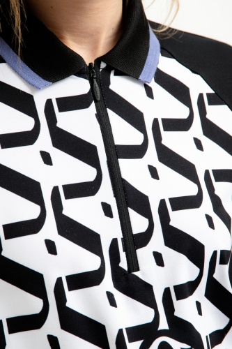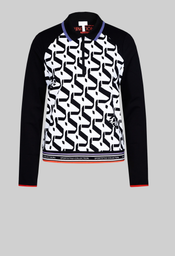 Повседневная рубашку-поло с длинными рукавами. Классический вязаный воротник имеет контрастную полоску по краю и заканчивается короткой молнией, гарантирующей комфортное одевание. Передняя часть с эксклюзивным графическим принтом со встроенными логотипами Sportalm привлекает всеобщее внимание. Рукава отделаны эластичной резинкой, а по низу имеется полосатая вышивка на манжете с надписью Sportalm. Классическую этикетку сзади заменяет принт из фольги.