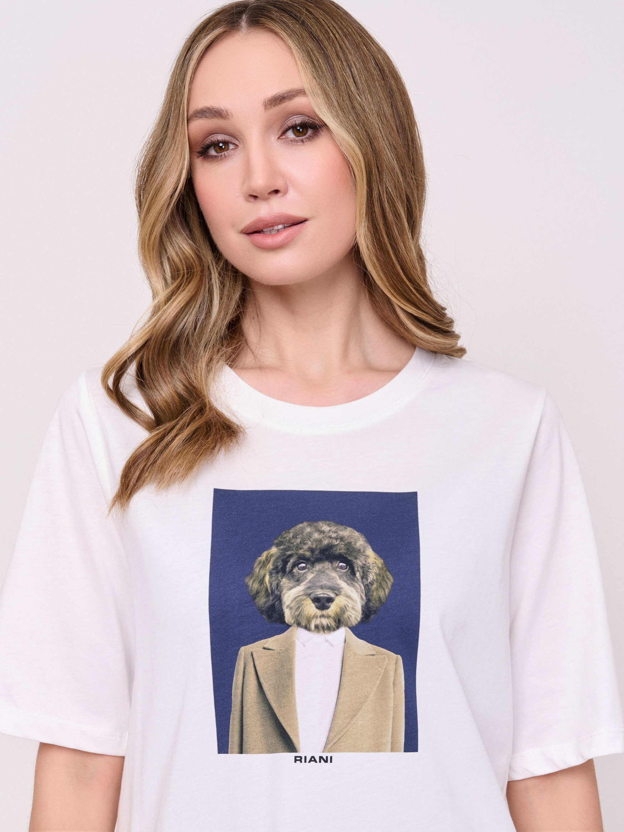 Детали: вырез горловины округлый, покрой прямой, рисунок принт, без надписи, боковые разрезы. Длина по спинке: 62 см.