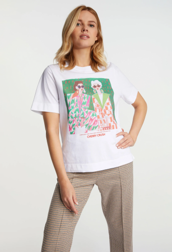 Стильной изюминкой этой футболки является надпись Cherry Crush с ярким цветным принтом. Широкий крой с разрезами и круглым вырезом. Длина для размера 42: 64 см. Окружность груди для размера 42: 96 см.