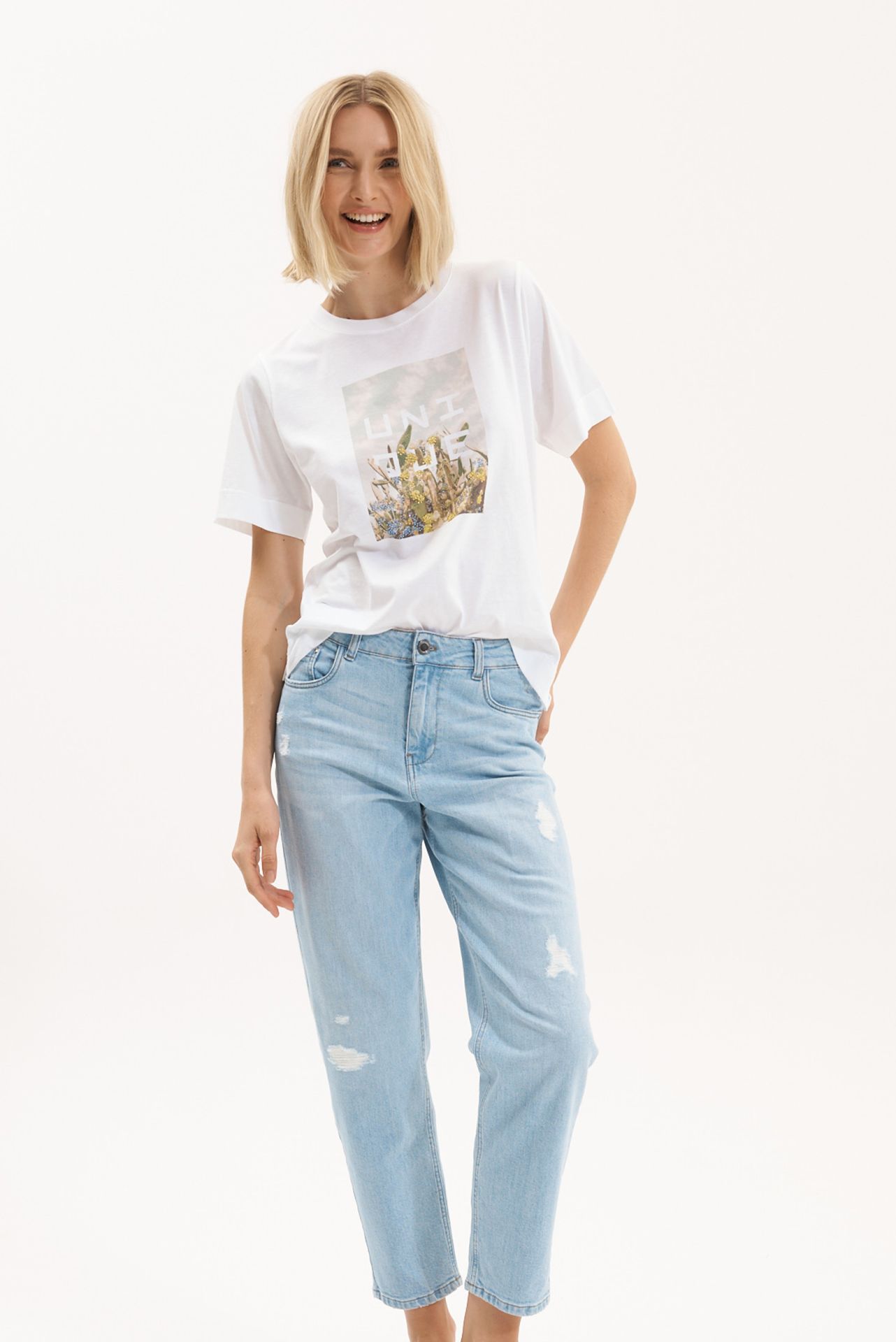 Белая футболка с размещенным принтом. Разноцветное фото кактуса с уникальным логотипом и нанесением страз. Немного укорочена. Короткий рукав. Длина: 62 см.