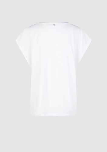 Комбинация хлопка и модала этой футболки с изысканным праздничным принтом обеспечивает максимальный комфорт. У него повседневный крой и классический круглый вырез. Модный вырез на плечах подчеркивает свободный стиль.