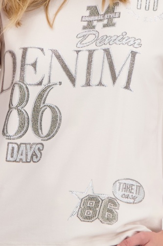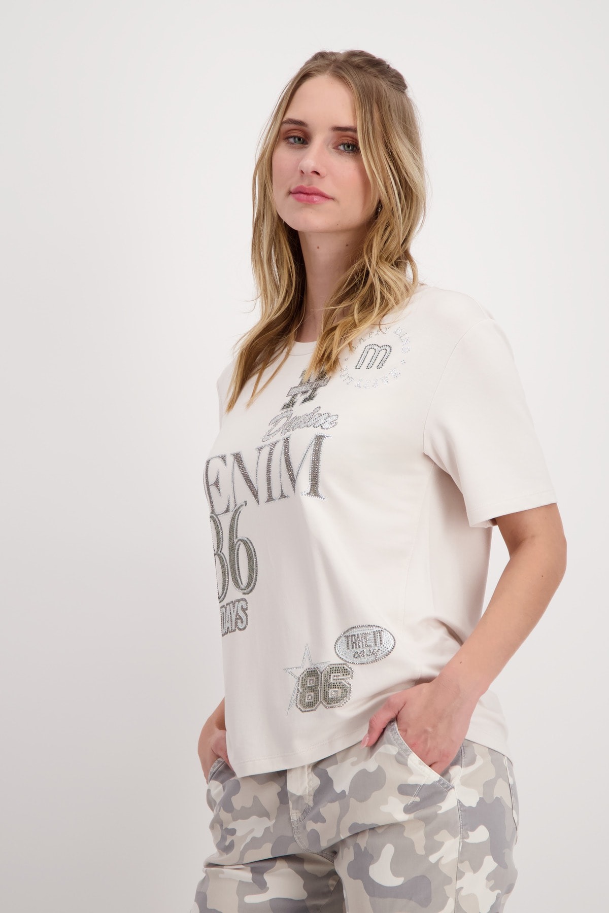 Стильная футболка из струящейся смесовой вискозы, украшенная сверкающими надписями из страз. Регулярная посадка. Круглый вырез. Короткие рукава слегка внахлест. Предварительный боковой шов. Удлиненная, закругленная спина. Длина спинки 44-го размера составляет 63 см, длина переда 60 см.