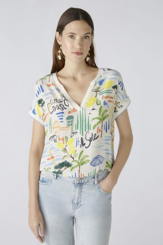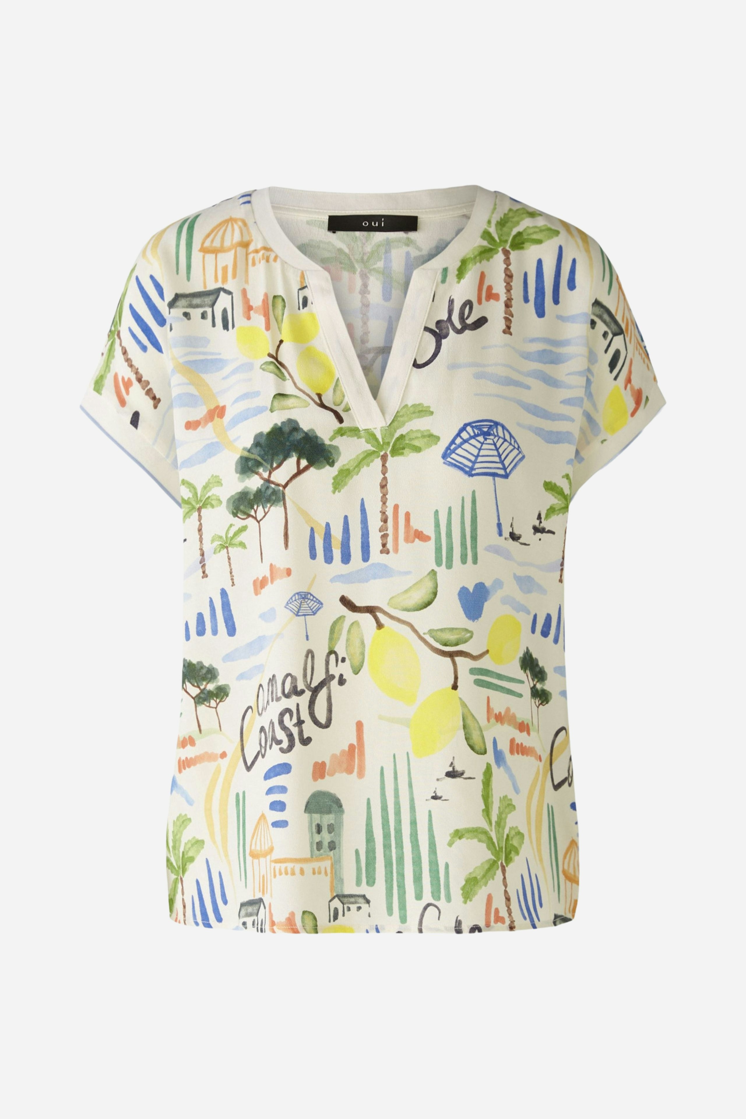 Блузка-рубашка - тканая блузка спереди с принтом oui exclusive, вдохновленным типичным ощущением отпуска на ривьере - удобная вставка из джерси с полосками сзади. Тканый вискозный креп спереди, трикотажная вставка сзади из эластичной смеси вискозы и хлопка. Повседневный крой, стандартная длина. Туника с вырезом. Ребристые манжеты на шее и рукавах. Закругленный низ, расширенный сзади. Каждая часть уникальна. Длина для размера 42: 64 см.