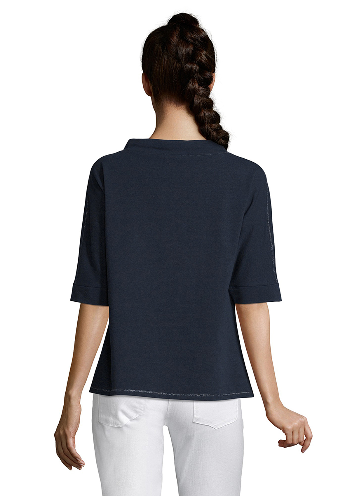 Футболка свободного покроя в стиле кэжуал. Широкая горловина с завязками, рукава 1/2 с подворотами. Металлизированный принт и декор пайетками придают образу демократичный вид. Декоративная отстрочка с нитью люрекса. Приятный к телу материал из смеси хлопка и модала. Эта модель создает непринужденный образ и великолепно подходит для прогулок и встреч с друзьями.