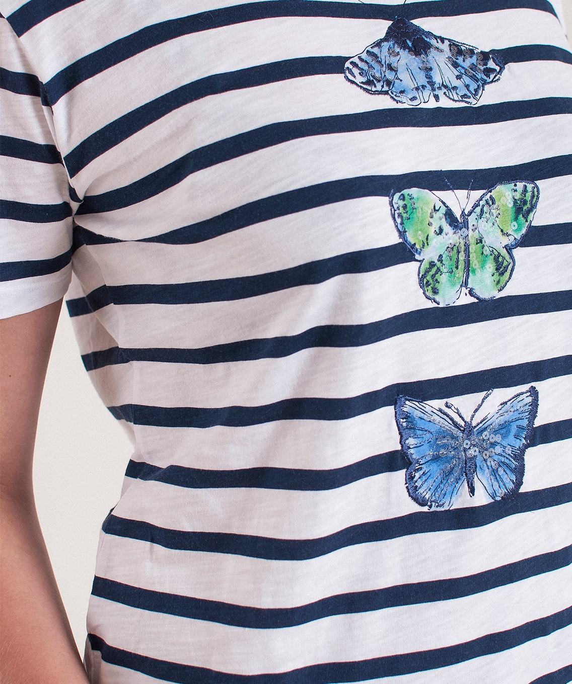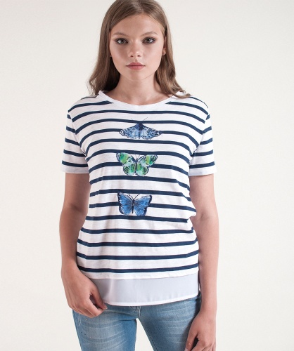 Футболка прямого покроя с имитацией модели-двойки. Горловина "лодочка". Принт с изображением бабочек, декор: пайетки.
