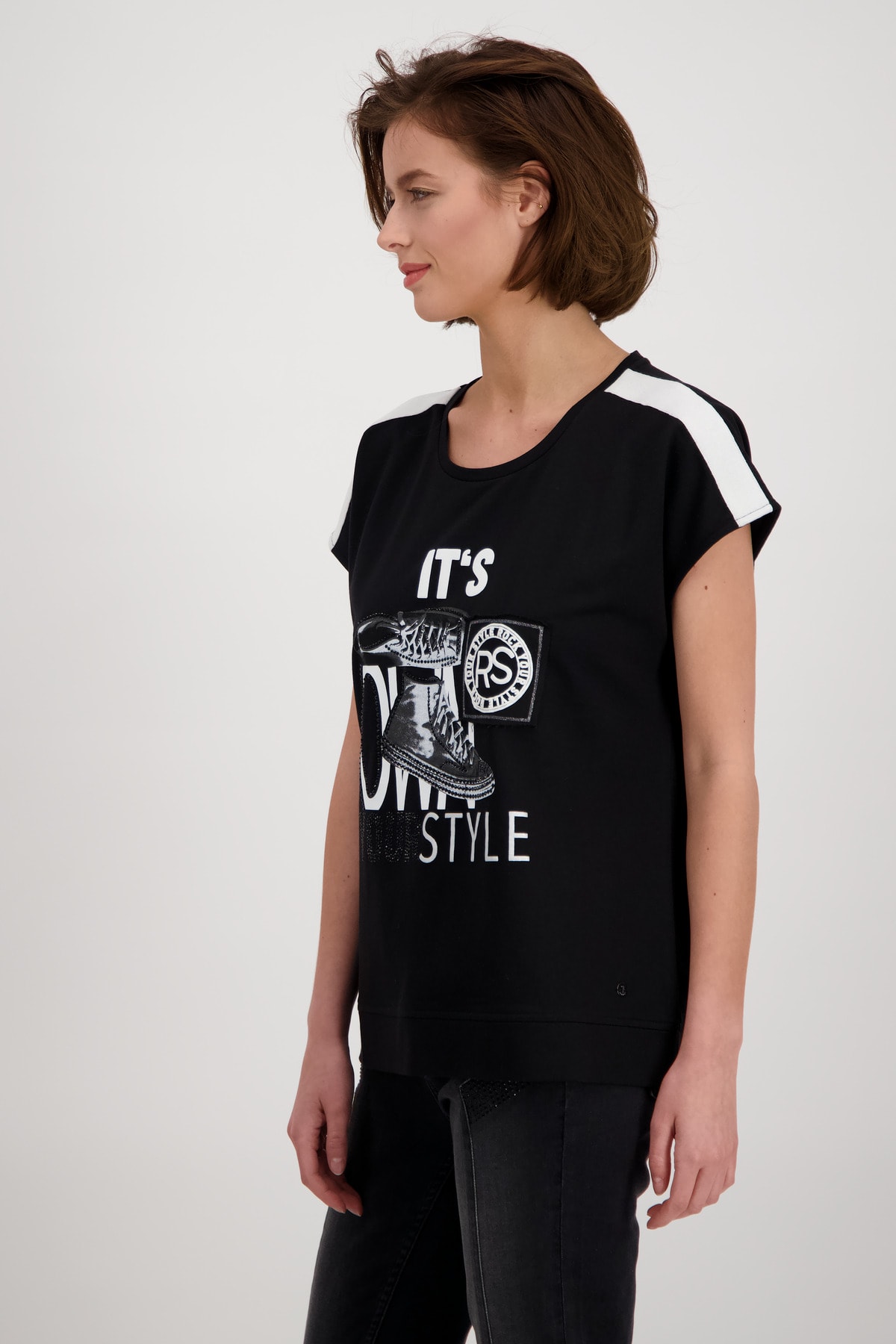 На сайте указаны российские размеры. Футболка из джерси с круглым вырезом, короткими рукавами и принтом. Модель прямого кроя с круглым вырезом горловины дополнена короткими рукавами большого размера и широким поясом по низу. Он становится изюминкой благодаря кокетке на плече с контрастной тесьмой, нашивке с блестками и эмблемой с объемными буквами, а также принту обуви с контрастной объемной надписью и сверкающими стразами. Сочетание хлопка и модала также обещает комфорт высокого качества. Носите его со стильными джинсами со стразами в тон, и образ будет более чем модным. Рост модели: 179 см. Длина по спине: 64 см.