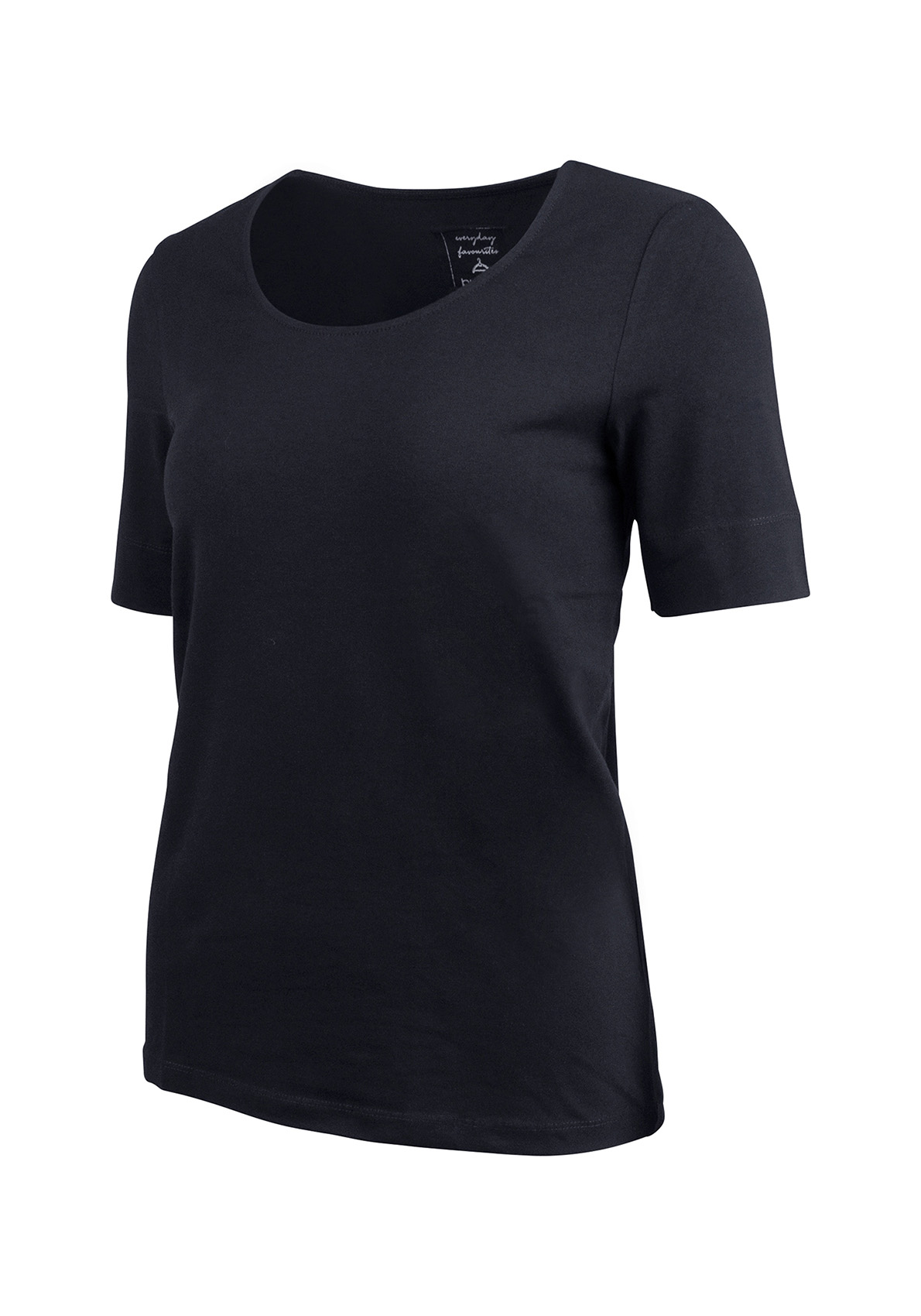 Эта классическая футболка с рукавом 1/2 и круглым вырезом горловины предоставляет широкий спектр возможных комбинаций. Данная модель сочетает в себе безупречный дизайн с удобным покроем. Высококачественная ткань из смеси хлопка и эластана обеспечивает комфорт в ношении и сохраняет форму даже после стирки! Благородную базовую футболку можно сочетать с легким кардиганом или элегантным блейзером.
