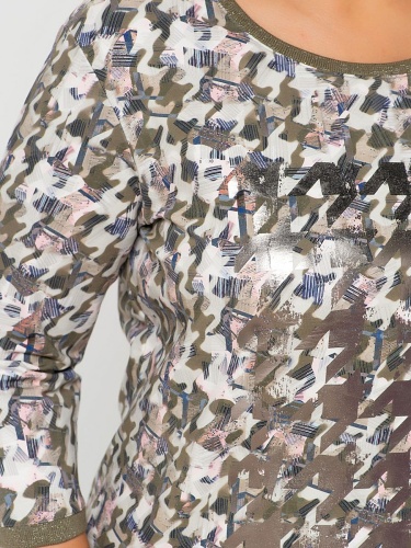 Эта футболка обращает на себя внимание благодаря необычному абстрактному принту. Слегка приталенный силуэт, круглый вырез горловины, втачные рукава 3/4. Отделка с нитью люрекса придает легкий блеск. Приятный к телу материал из хлопковой смеси обеспечивает комфорт.
