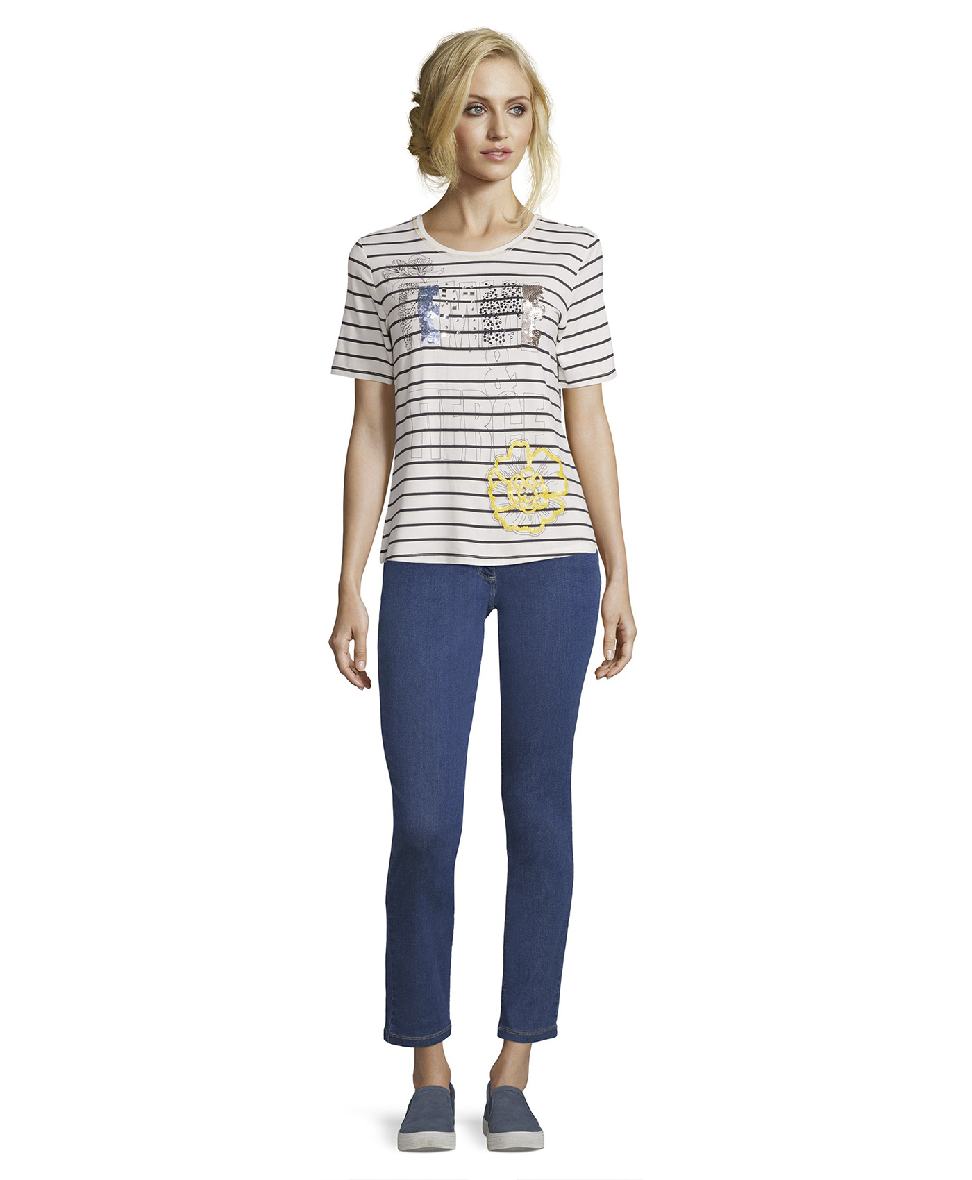 Полосатая футболка с принтом и пайетками - воплощение стиля кэжуал! Прямой покрой, круглый вырез горловины, рукава 1/2. Материал из вискозной смеси приятен к телу и обеспечивает комфорт. Эта футболка отлично дополняет образ с джинсами и кроссовками.