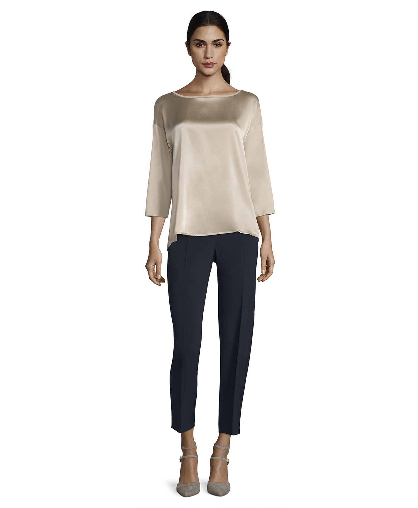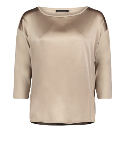 Футболка свободного покроя. Круглый вырез горловины, рукава 3/4 со спущенным плечом. Материал из вискозной смеси приятен к телу и обеспечивает комфорт. Блестящий материал переда футболки придает модели элегантный вид. Однотонная футболка является базовой вещью, поэтому отлично сочетается с любыми элементами гардероба.
