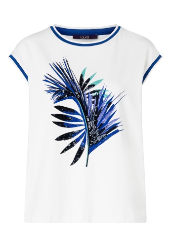 Свободный силуэт в тренде! Футболка прямого покроя с круглым вырезом горловины и короткими цельнокроеными рукавами. Отделка тесьмой на горловине и рукавах. Растительный принт украшен стразами и пайетками. Приятный к телу материал из хлопковой смеси.
