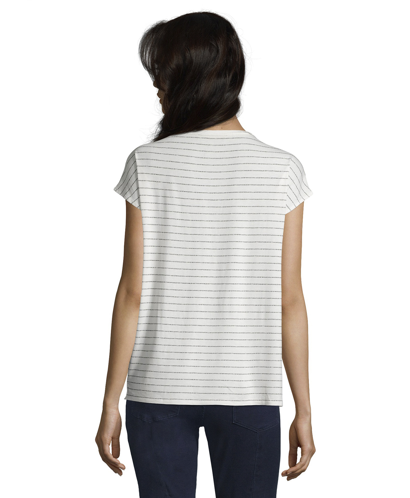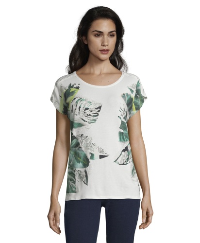 Футболка прямого покроя. Широкий круглый вырез горловины, короткие цельнокроеные рукава. Принт с надписью и трендовыми тропическими мотивами. Спинка изделия выполнена из материала с принтом в полоску. Приятный к телу материал из вискозной смеси. В сочетании как с брюками, так и с юбкой эта футболка создает стильный современный образ.