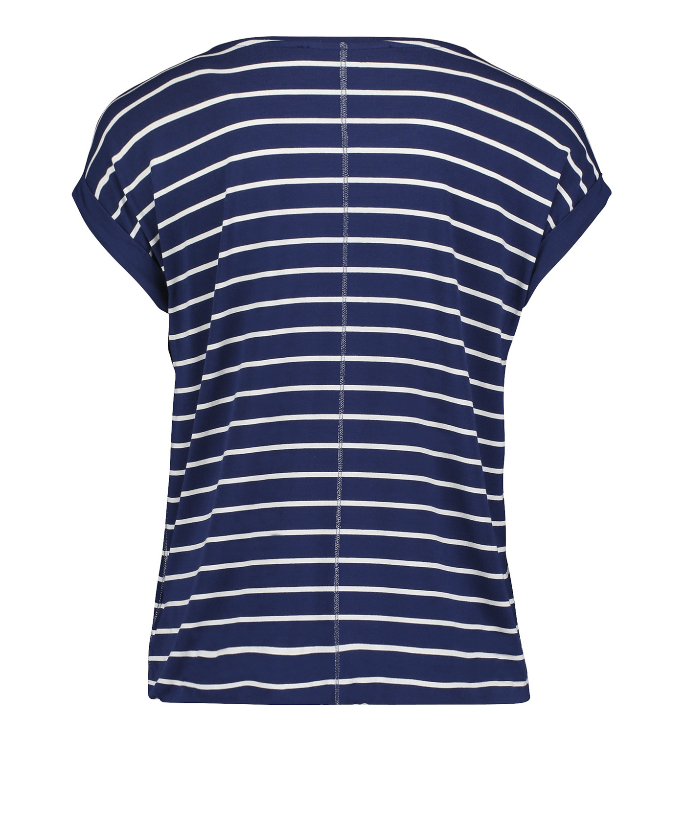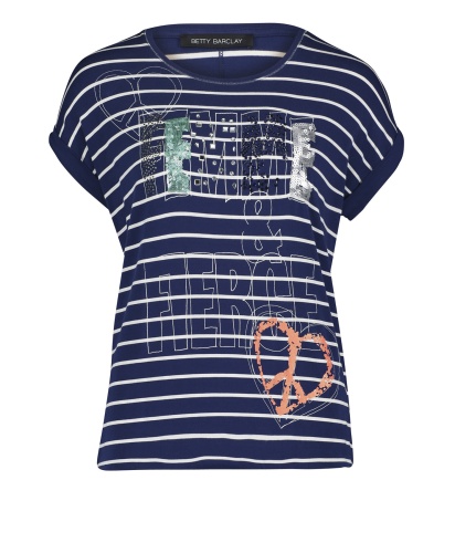 Новая интерпретация тренда на полоску! Полосатая футболка с принтом. Прямой покрой, круглый вырез гороловины. Короткие цельнокроеные рукава с фиксированными манжетами. Россыпь из страз и пайеток придает образу нотку гламура. Материал из вискозной смеси приятен к телу и обеспечивает комфорт. Эта футболка станет изюминкой множества образов в стиле кэжуал.