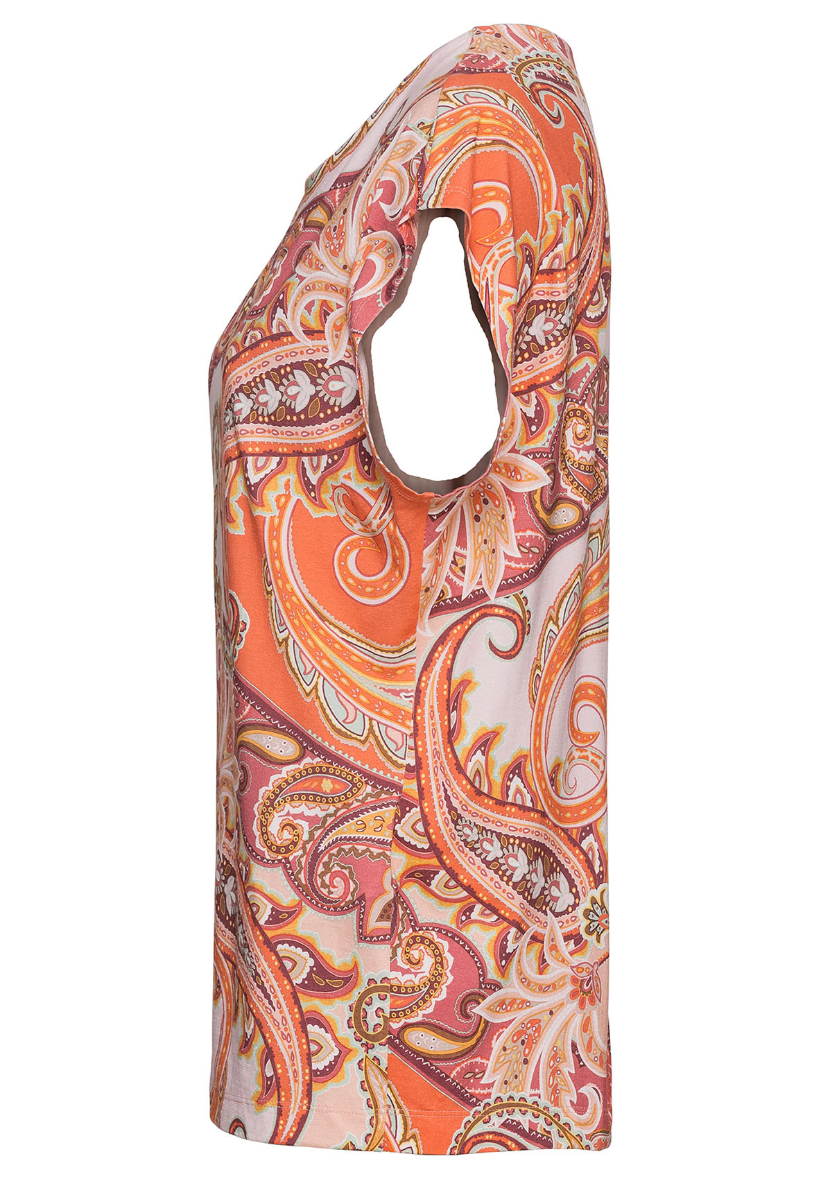 Раскрасьте лето с футболкой Julie! Принт "пейсли" в модных цветах заставит вас сиять! Футболка очень удобна в ношении благодаря материалу из смеси вискозы и эластана. Другие элементы дизайна футболки - цельнокроеные рукава, круглый вырез и слегка приталенный силуэт. Эта футболка - стильный компаньон для бесчисленных образов. • принт "пейсли" в модных цветах • мягкая вискозно-эластановая смесь • круглый вырез, цельнокроенный рукав • слегка приталенный силуэт • длина: около 64 см