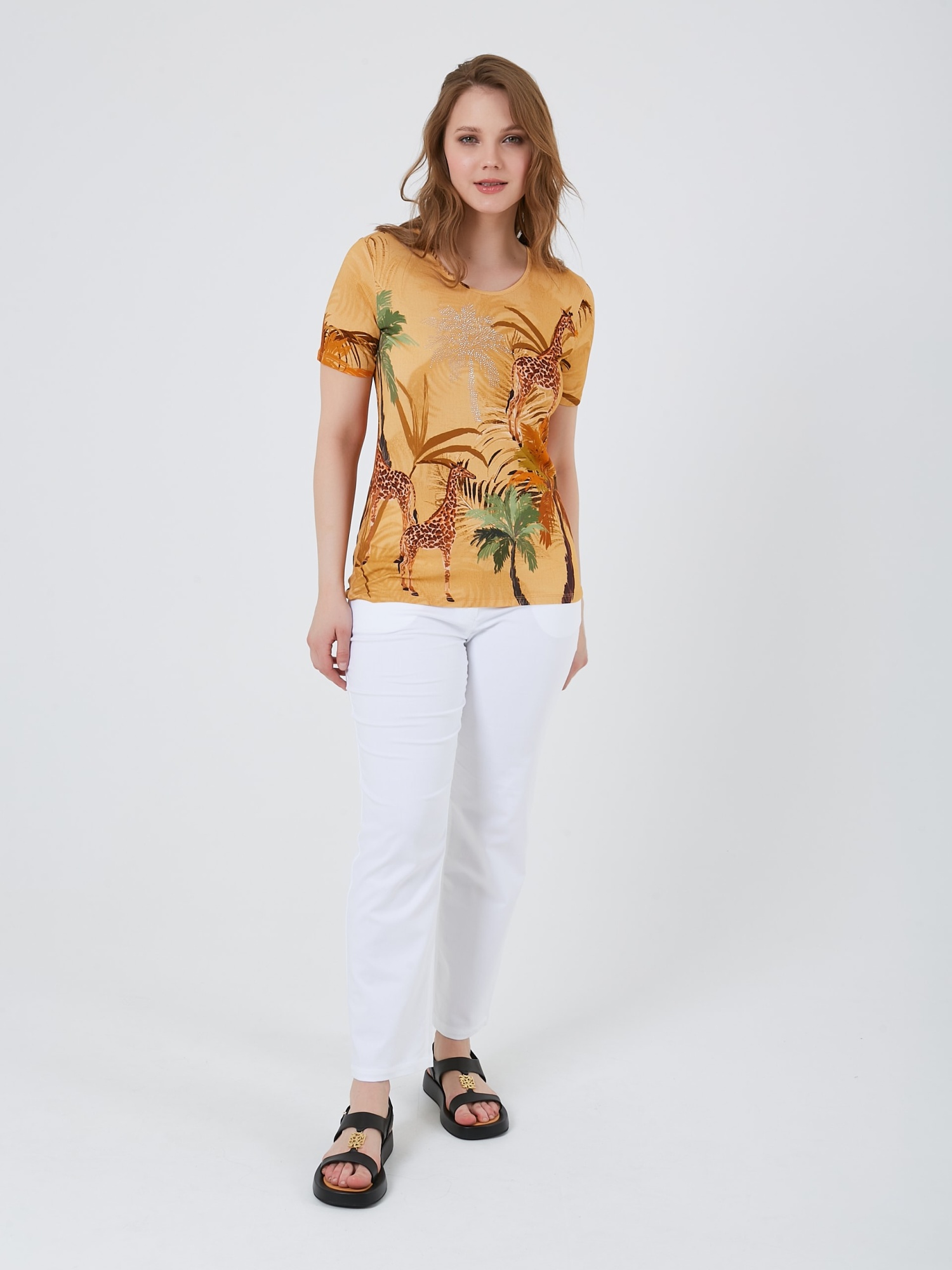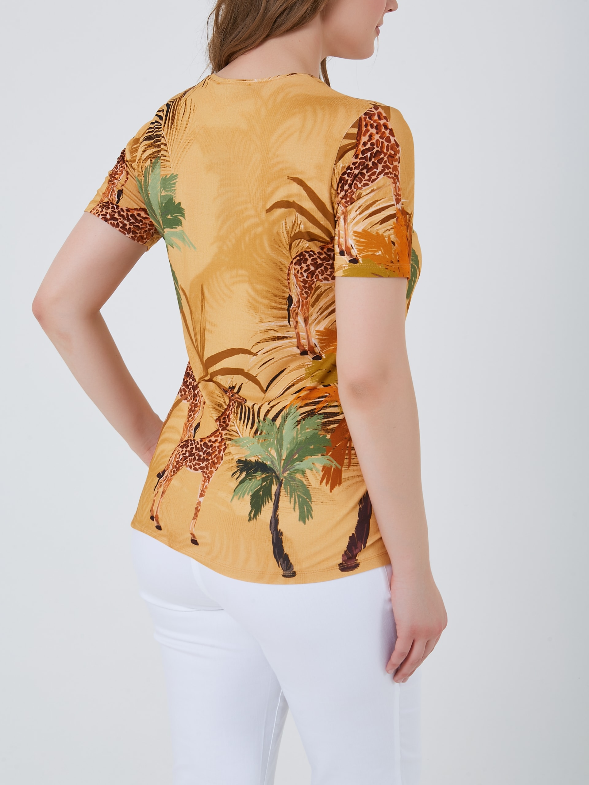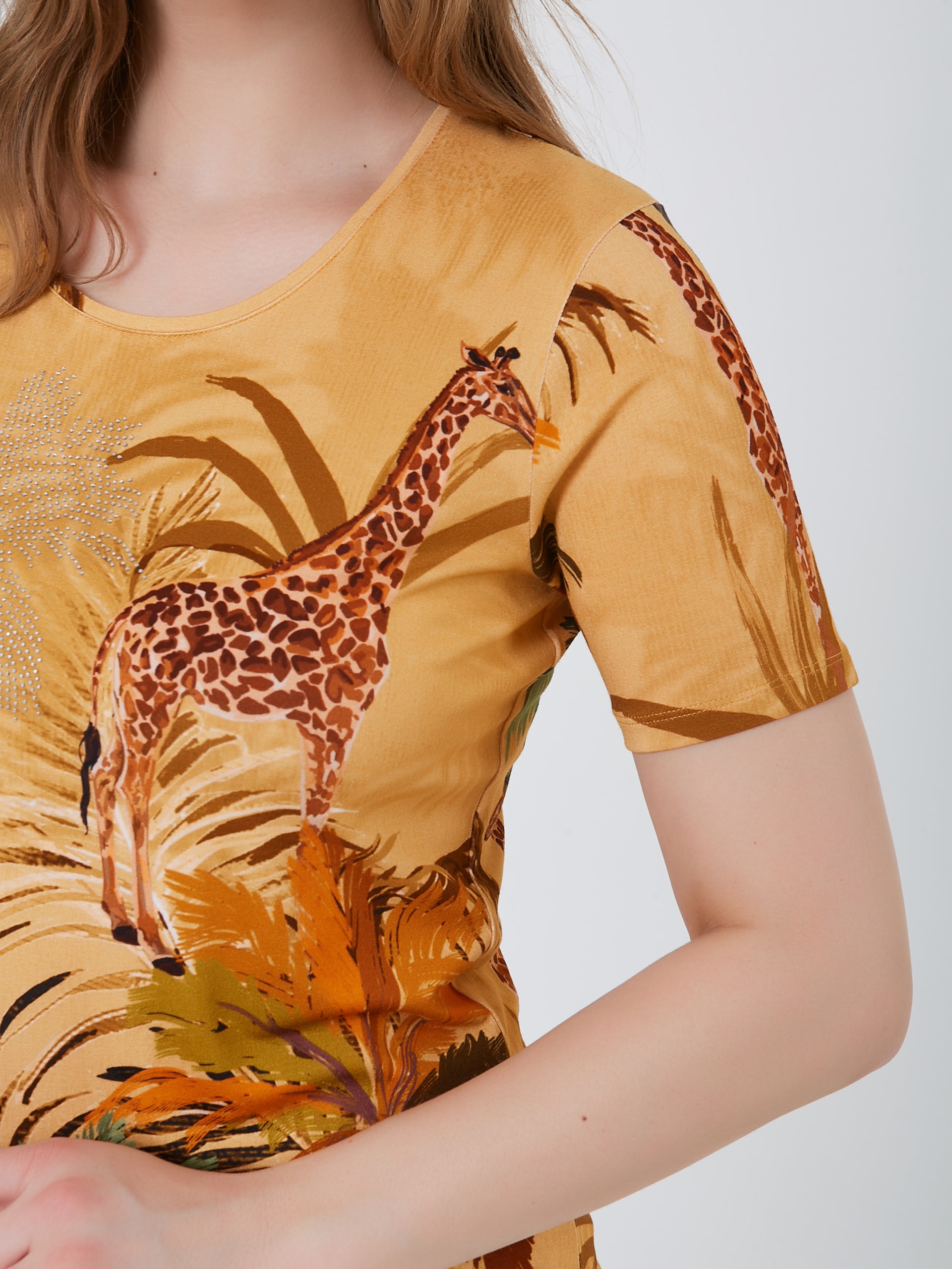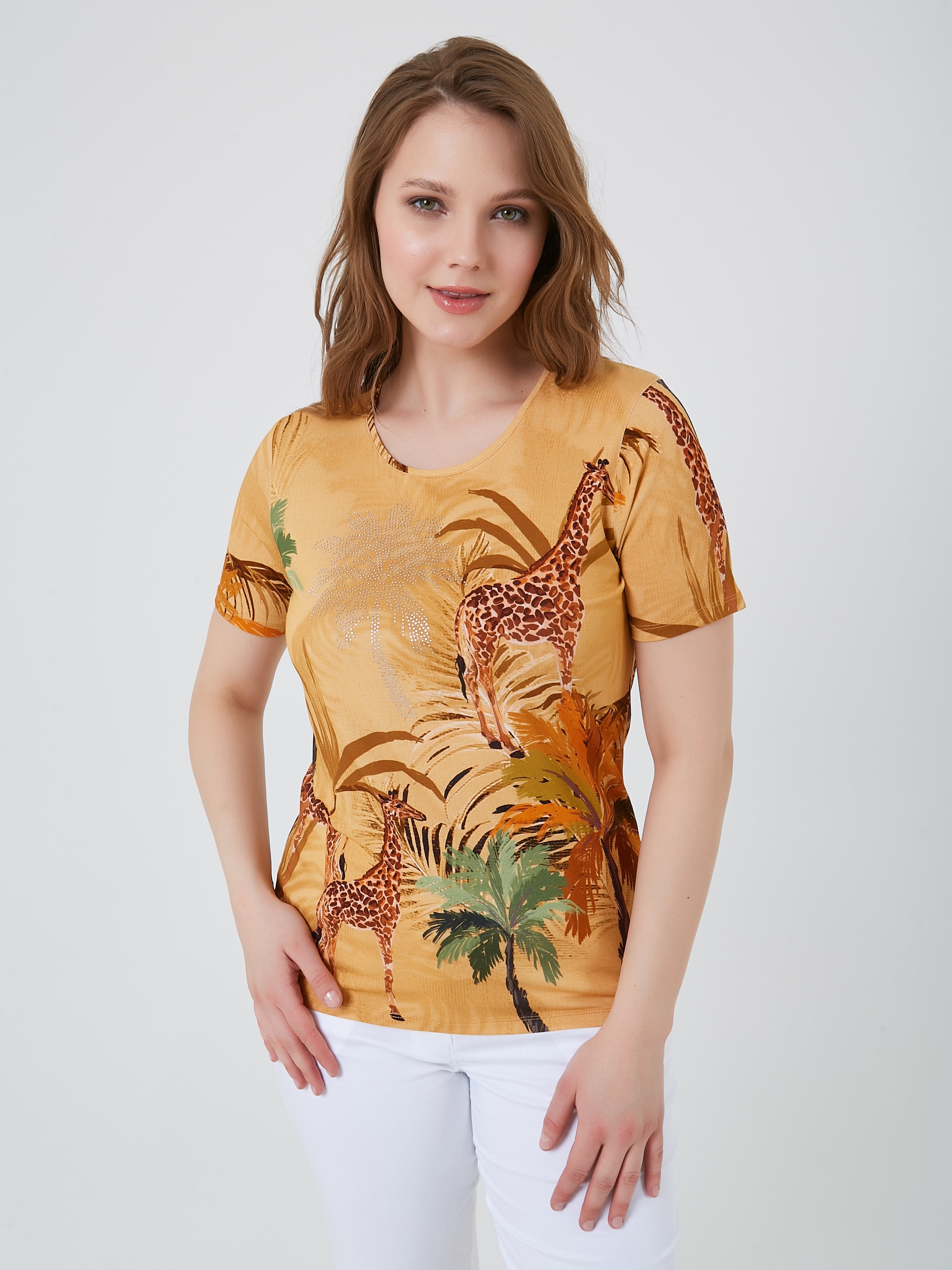 Яркая футболка горчичного цвета с принтом жирафов на фоне пальм, идеально подходит для создания летнего, яркого образа. Весна-Лето 2025. Капсула "Рио де Жанейро". Параметры модели: 95-64-101, рост 175, размер 44-46