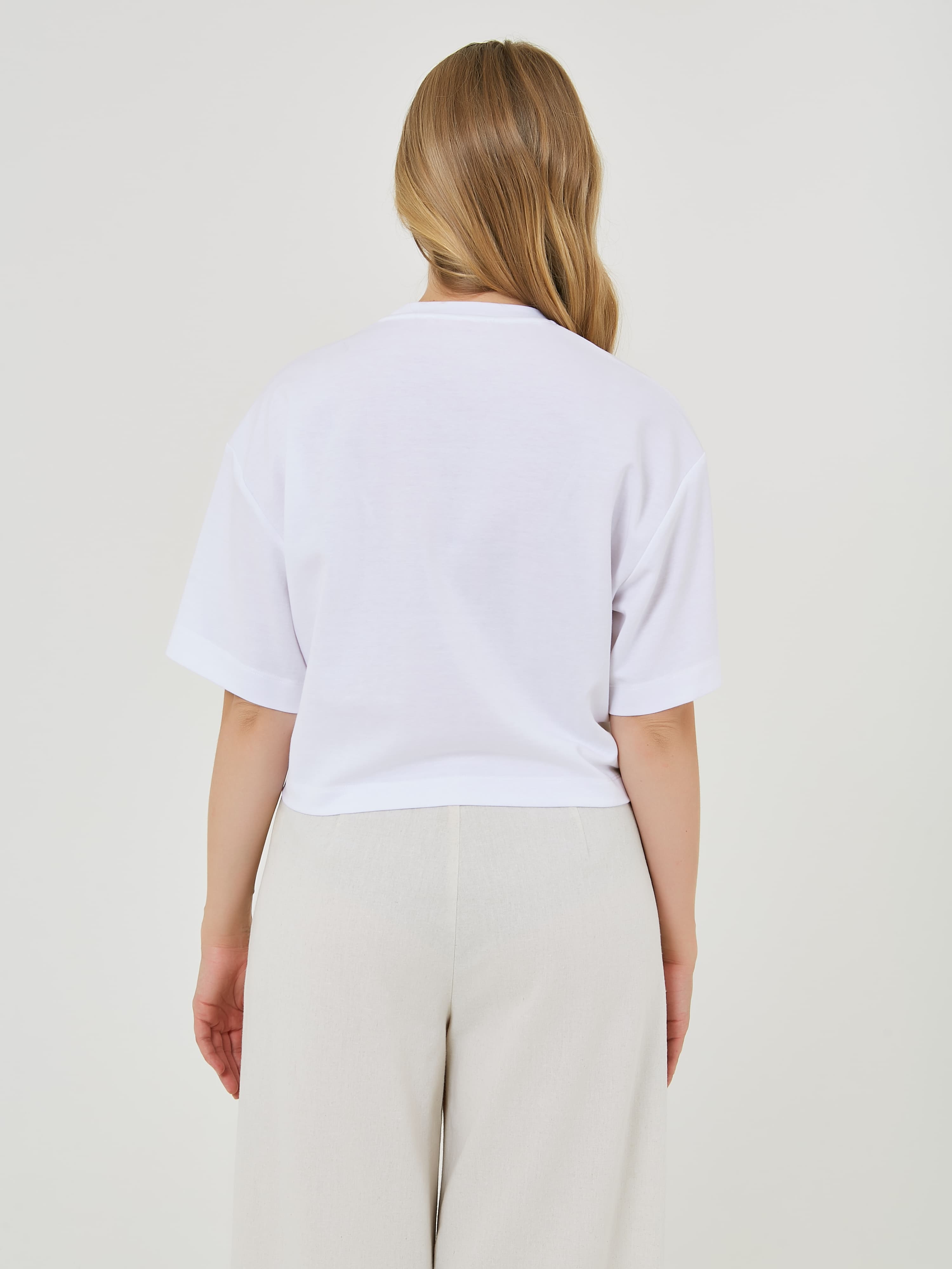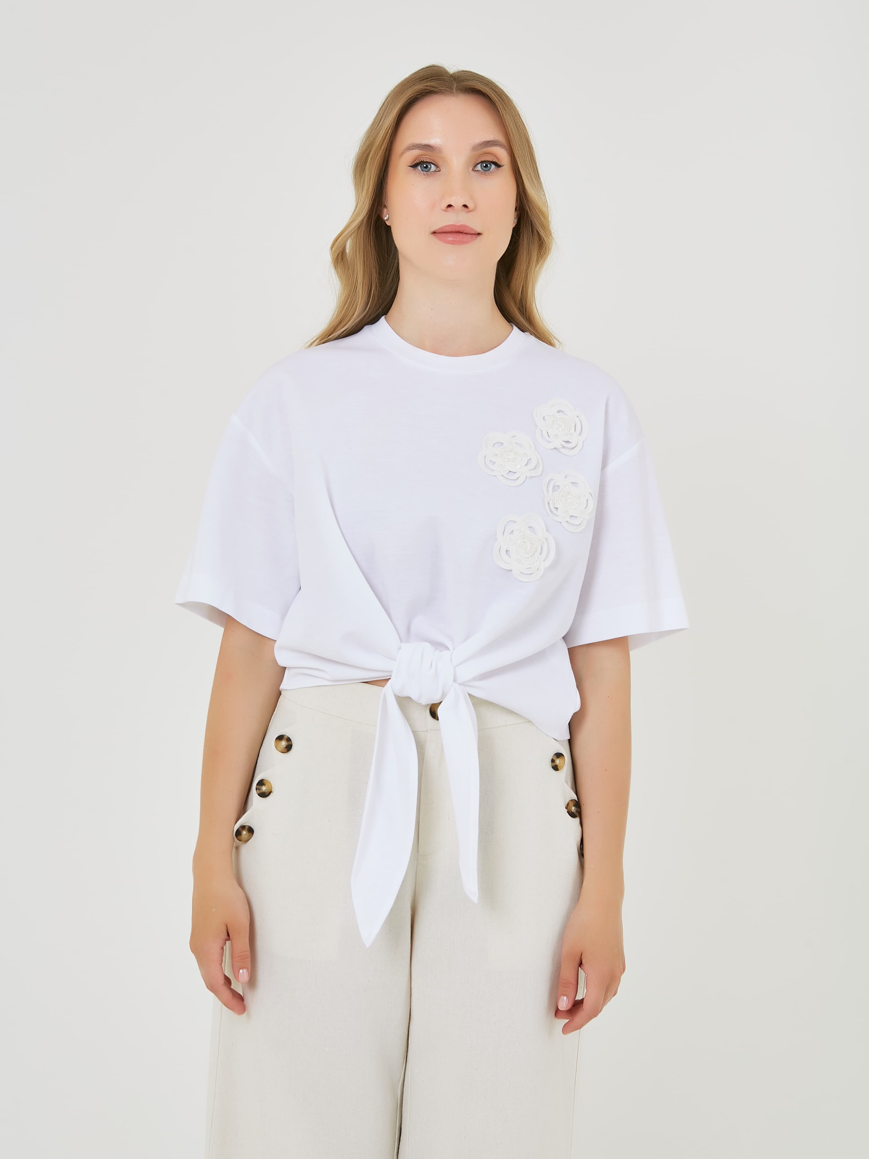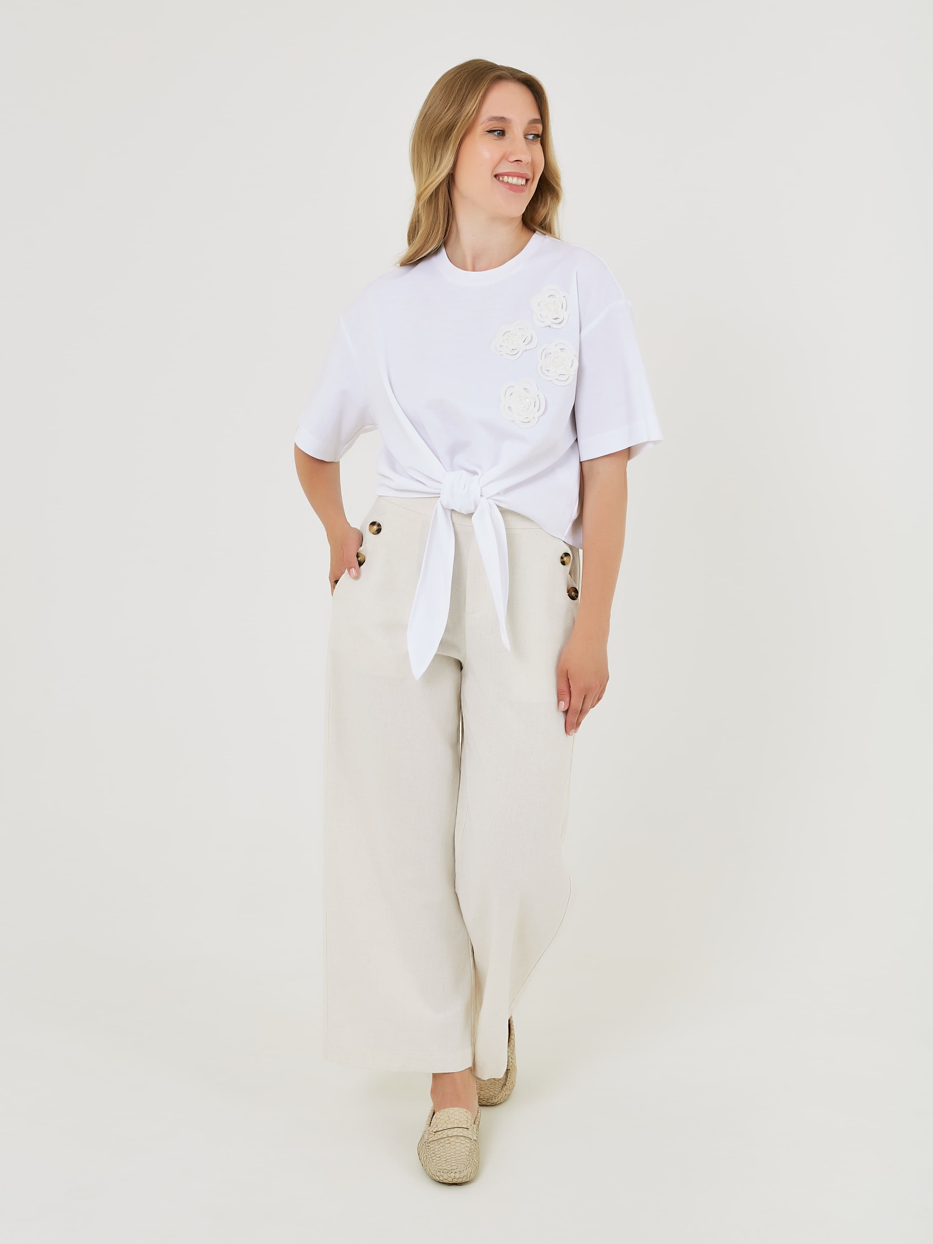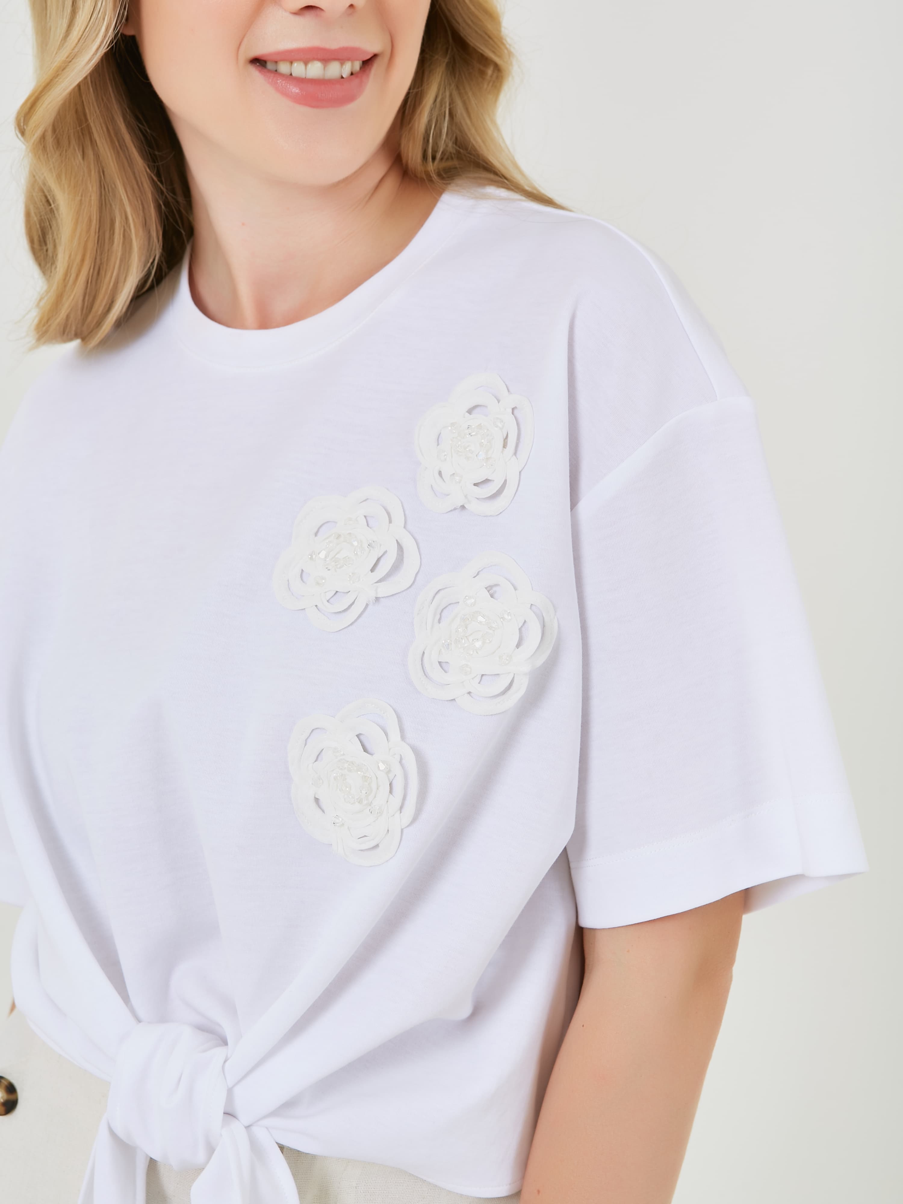 Белая футболка с завязкой на талии и декоративными цветочными аппликациями. Футболка имеет короткий рукав и круглый вырез горловины. Весна-Лето 2025. Капсула "Рио де Жанейро". Параметры модели: 89-70-92, рост 167, размер 44-46