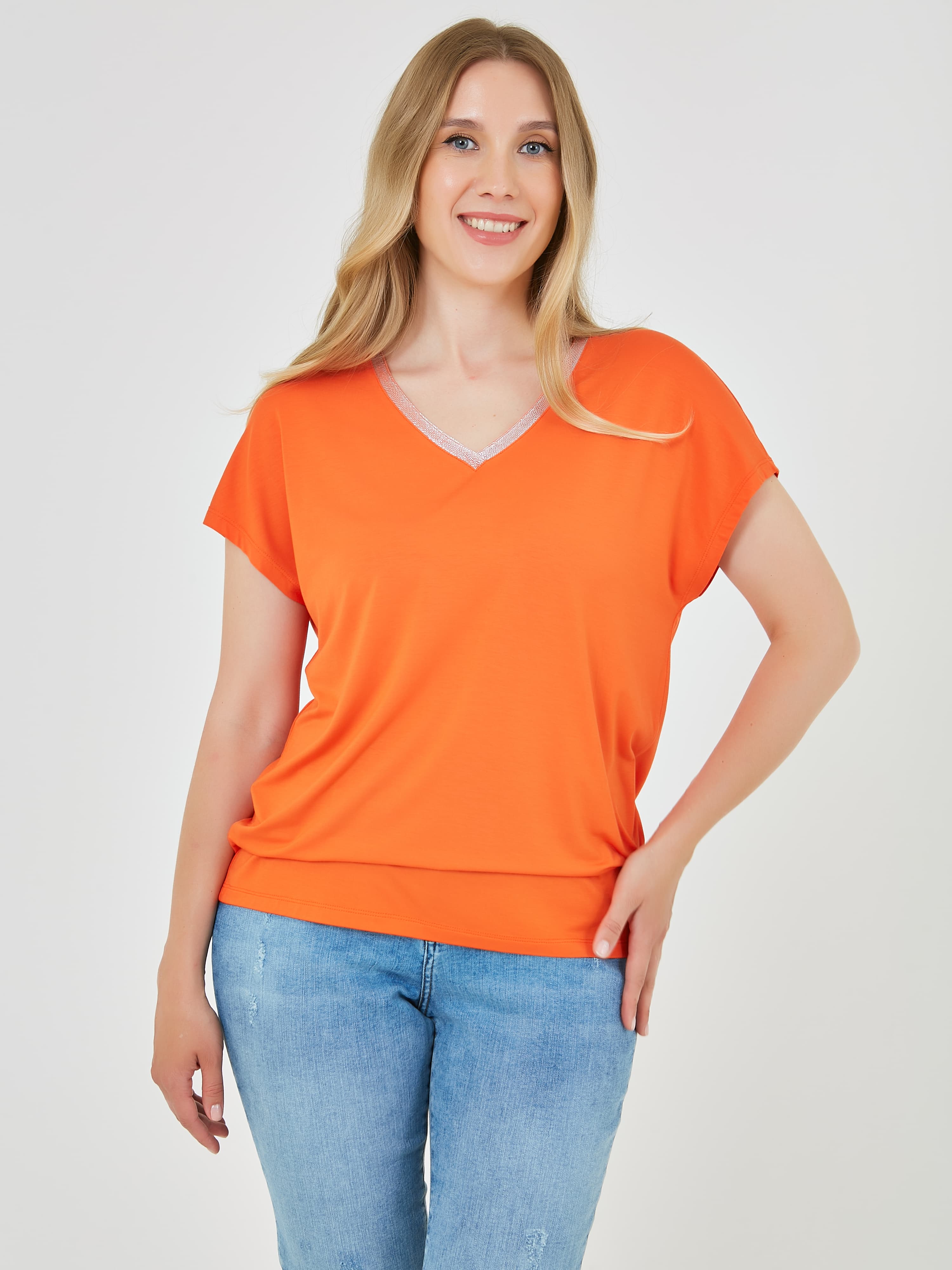 Яркая футболка с V-образным блестящим вырезом и свободным кроем. Коллекция Весна-Лето 2025. Капсула "Санторини". Параметры модели: 89-70-92, рост 167, размер 44-46