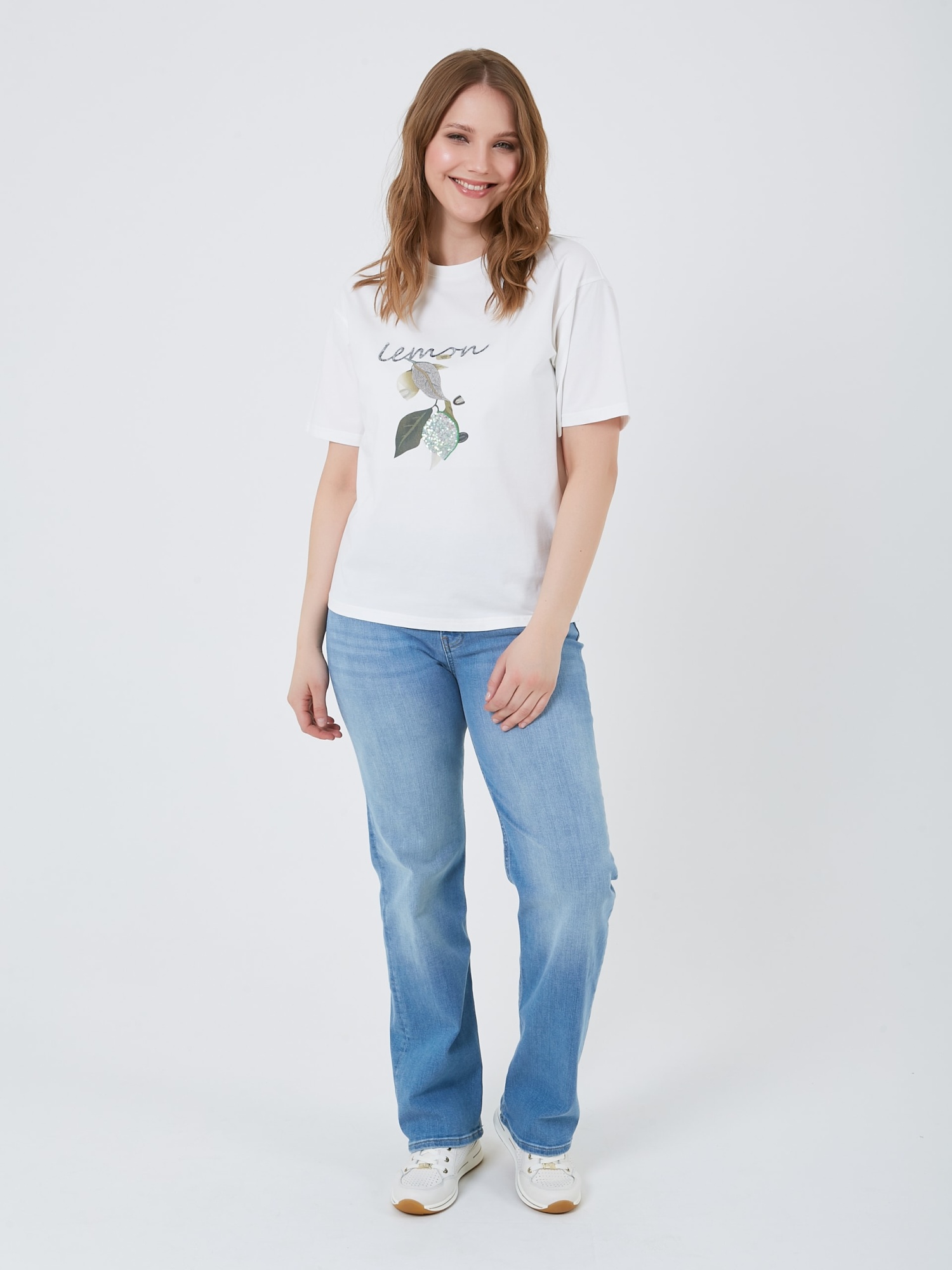 Футболка выполнена в белом цвете и украшена ярким принтом с изображением лимона. Модель имеет классический крой с круглым вырезом, что делает её подходящей для повседневной носки. Коллекция Весна-Лето 2025. Капсула "Рио де Жанейро". Параметры модели: 95-64-101, рост 175, размер 44-46