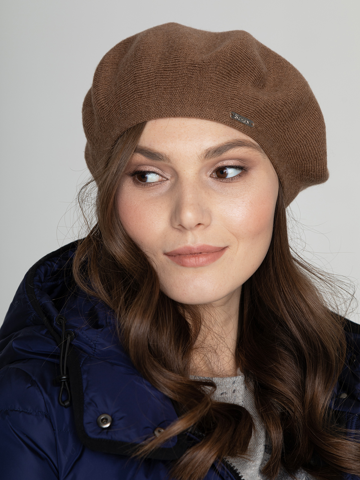 Вязаный берет с выполнен в нежном оттенке. Модель универсальна, подходит для любого типа лица. Украшение в виде металлического лейбла.