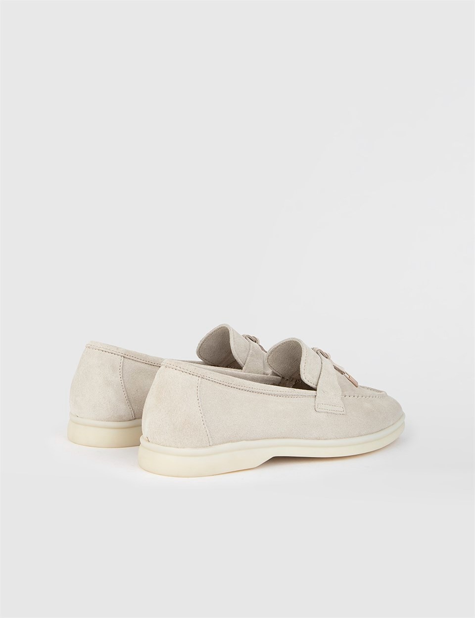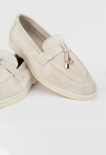 Бежевые замшевые кожаные женские лоферы. Изготовлено из высококачественной телячьей кожи. Bысота подошвы: 2,5 см. Резиновая подошва. Ручная работа.