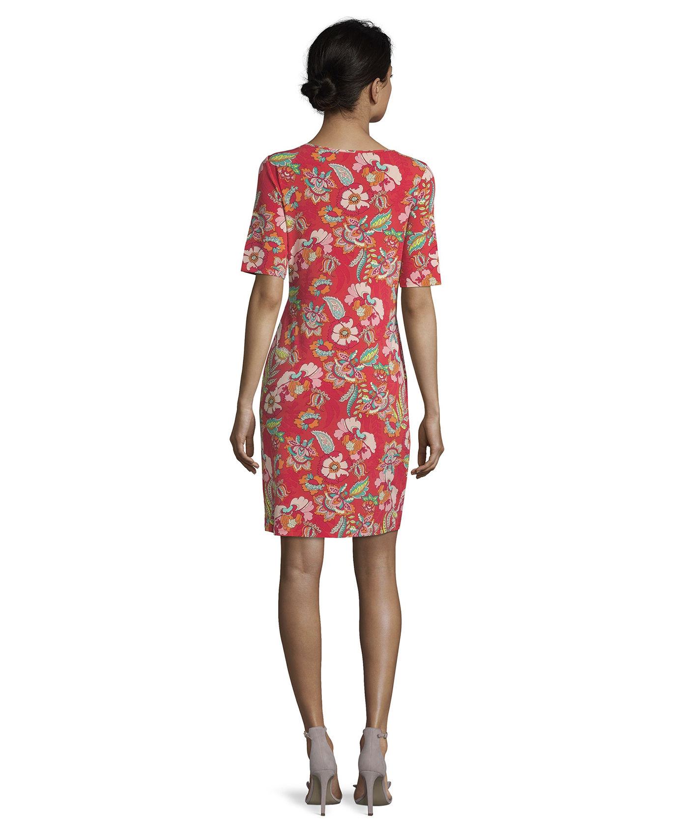 Платье-футляр - невероятно женственная модель! Круглый вырез горловины, рукава 1/2. Трендовый цветочный принт. Завершает дизайн элегантный элемент - складка в районе талии. Платье выглядит шикарно как с блейзером, так и с джинсовой курткой.