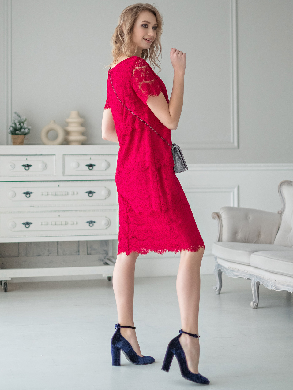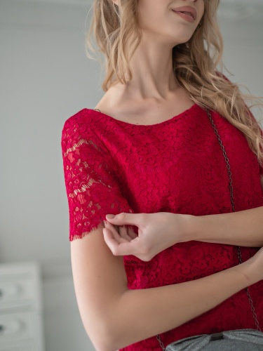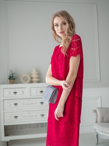 Ярко красное платье из кружева прямого кроя сгладит все недостатки фигуры и подчеркнет достоинства. Длина до середины колена, замок-молния на спинке платья, втачной рукав до середины плеча. Платье станет частью обворожительного вечернего образа.