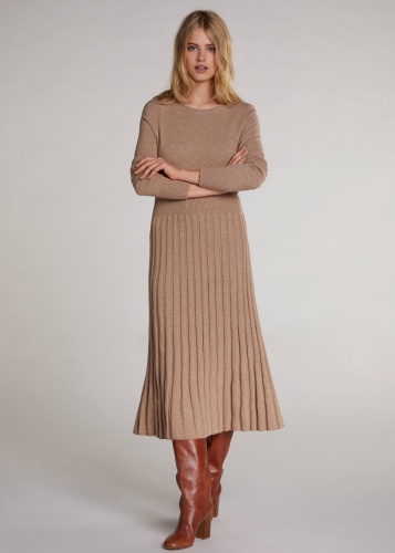 Трикотажное платье с плиссированной юбкой для уютного повседневного образа. Длина миди, приталенный силуэт, втачной рукав полной длины, широкая овальная горловина. Смесовая шесть в составе обеспечивает комфорт в ношении.