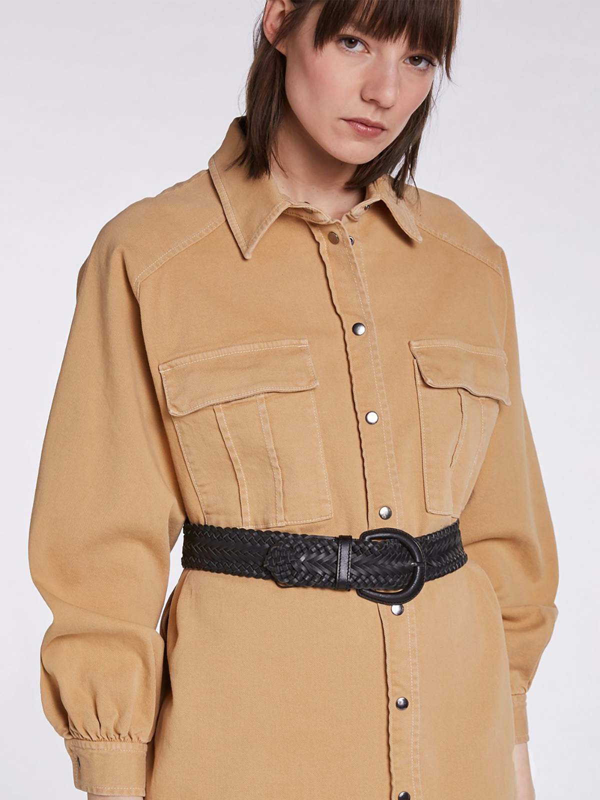 Песочное платье-рубашка из саржевого хлопка. Отложной рубашечный воротник, платка с контрастными пуговицами. Длинный втачной рукав с широкими манжетами. Объемныме накладные карманы на груди. Длина 42 размера: 98 см. Рост модели 178 см, ее размер - 42 (российский).