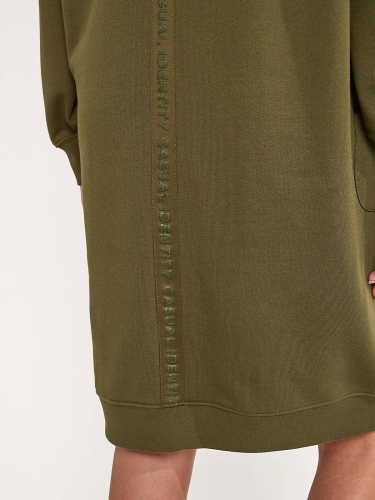 Однотонное платье-толстовка в спортивном стиле. Свободный силуэт, длина мини. Объемный капюшон с кулиской. Накладные карманы спереди. Длинные втачные рукава с манжетой. Эластичная резинка по низу подола.