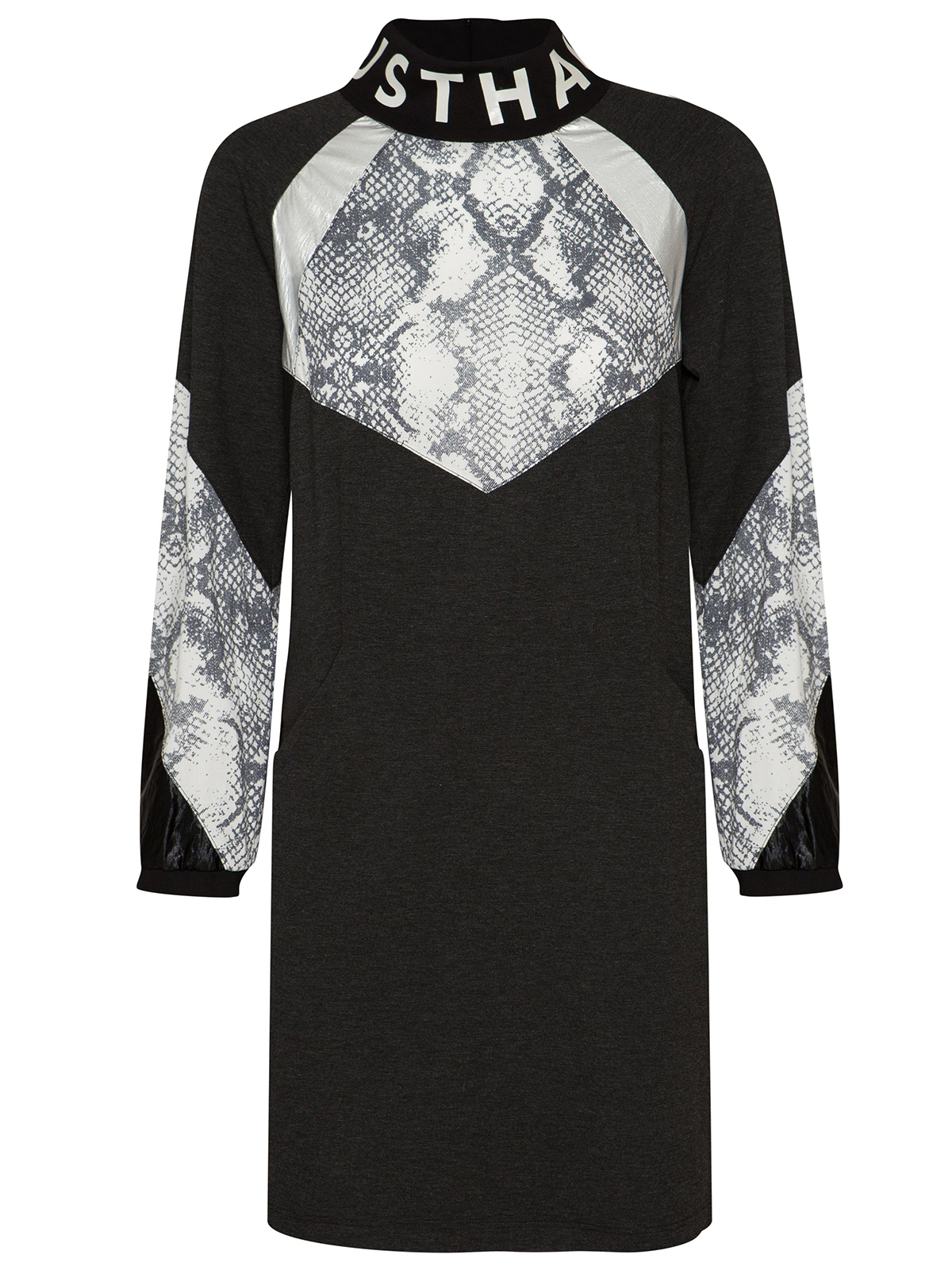 Стильное экстравагантное платье в спортивном стиле со вставками в питоновом узоре и экокоже. Длина мини, полуприталенный силуэт. Широкий воротник стойка украшен надписью.