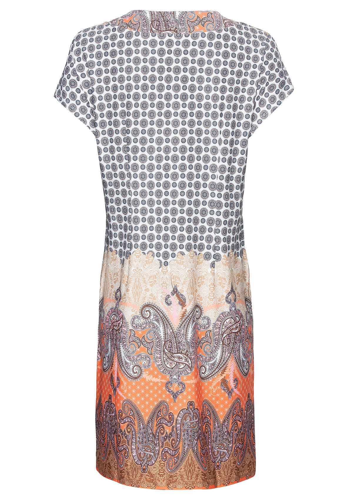 Модное платье Marill привносит сочные цвета и изысканность в ваш гардероб: благодаря модному принту и удобству в ношении платье из джерси станет просто необходимым в этом сезоне. Сочетание узоров создает стильные контрасты: принт "пейсли" дополняется модным орнаментом. В дизайне множество интересных деталей: V-образным вырез, цельнокроеные рукава, декоративная складка под грудью, карманы в боковых швах. Платье прекрасно сочетается с обычными кроссовками и кардиганом. • платье без подкладки с принтом пейсли • струящаяся эластичная трикотажная ткань • складка под грудью, V-образный вырез, карманы • длина 97 см, рост модели - около 180 см • на рост 168 см платье будет длиной до колен
