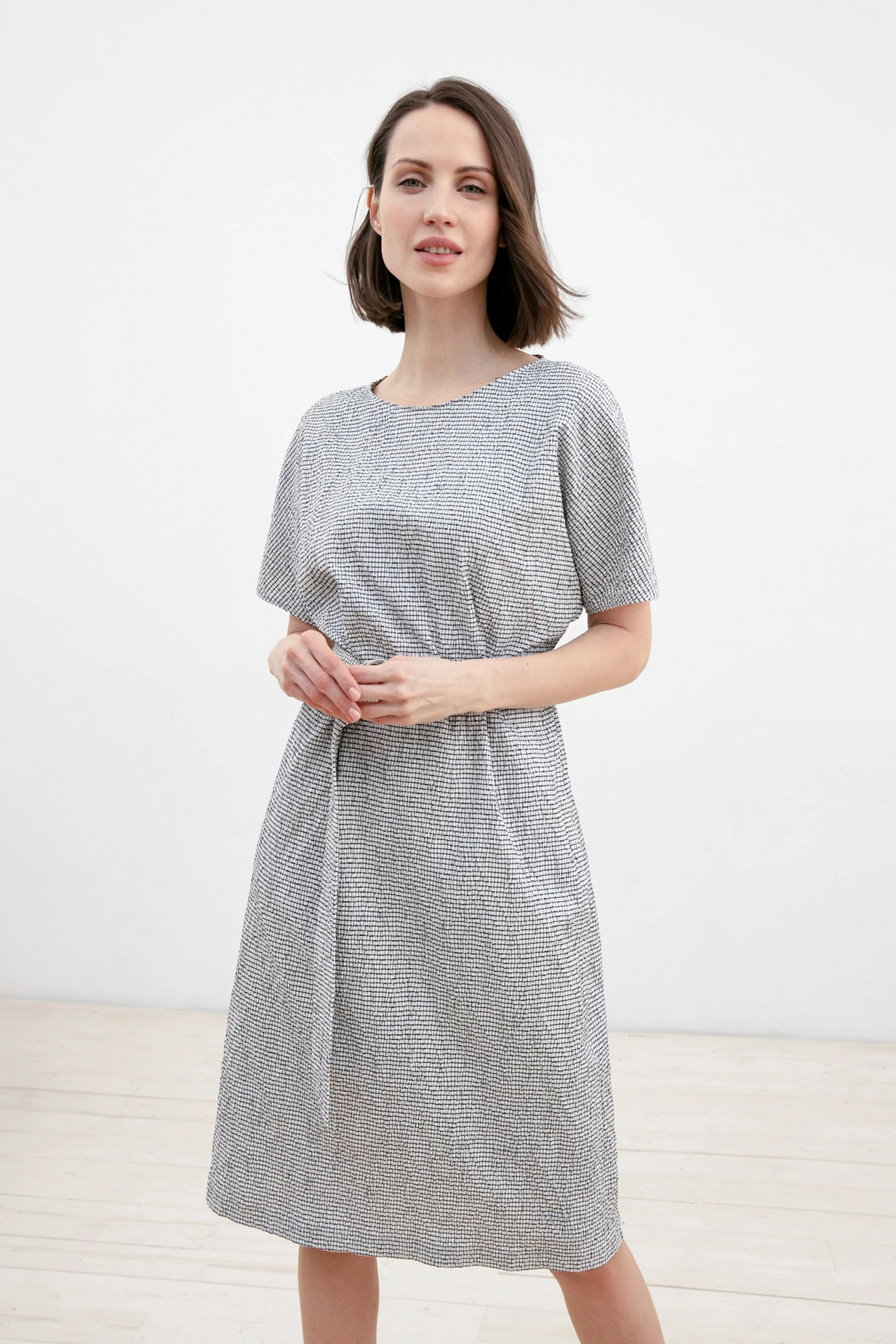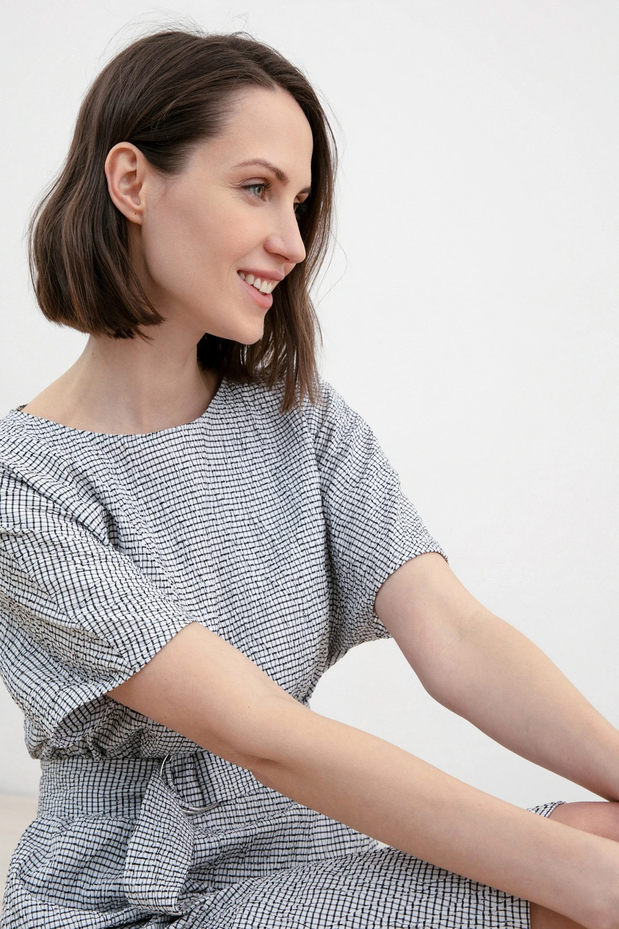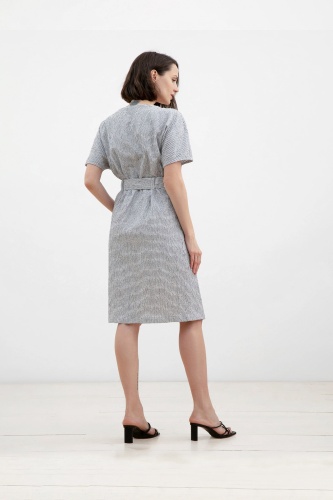 Российский бренд. На сайте указаны Российские размеры. Женственное платье из фактурной вискозной ткани в черно-белом принте полуприлегающего силуэта с горловиной лодочка и коротким рукавом кимоно. На талии съемный пояс из ткани с полукольцами.