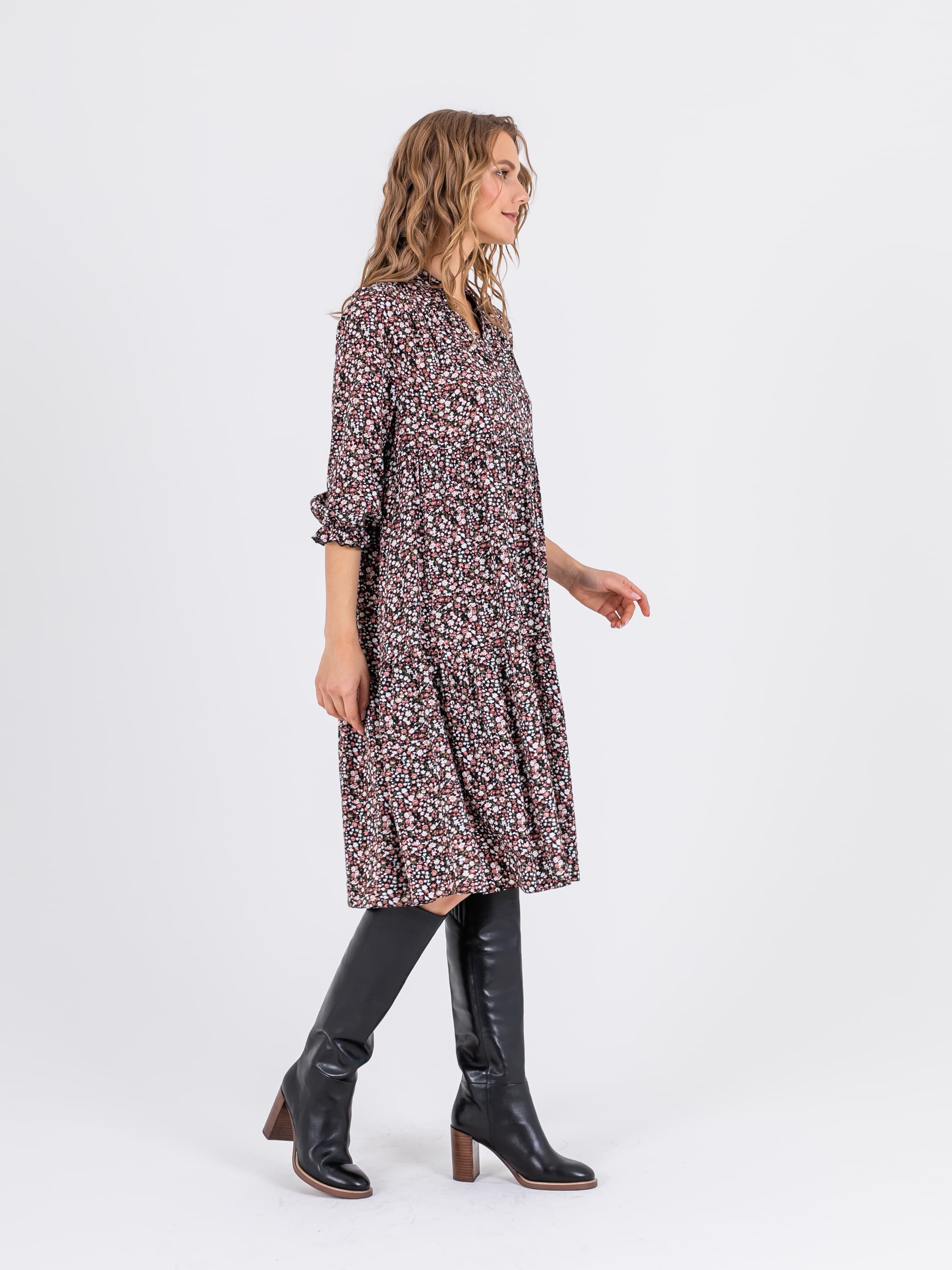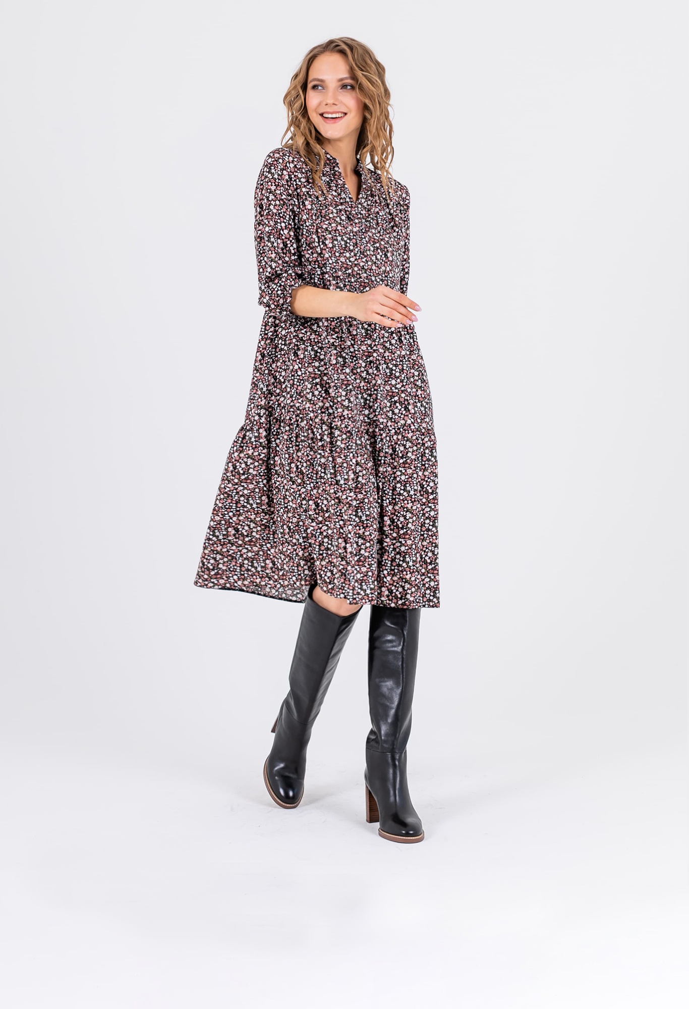 На сайте указаны российские размеры. Крой: платье свободного силуэта из гладкой вискозы в стиле бохо. Отрезное под грудью, расклешенное, имеет втачной рукав, низ которого собран на эластичную тесьму, что позволяет фиксировать его на комфортную высоту и разный объем рук. Платье состоит из двух ярусов, которые выгодное подчеркивают достоинства фигуры и изысканно маскируют недостатки. Платье подойдет женщинам разных фигур и комплекций, а в особенности будущим мамам и прекрасным обладательницам шикарных форм. Отделка: ткань в мелкий цветок создает женственный и романтичный образ, который влюбляет в себя с первого взгляда. Сочетайте с однотонными жакетами и кардиганами из ассортимента Stern. Рост модели 175 см.