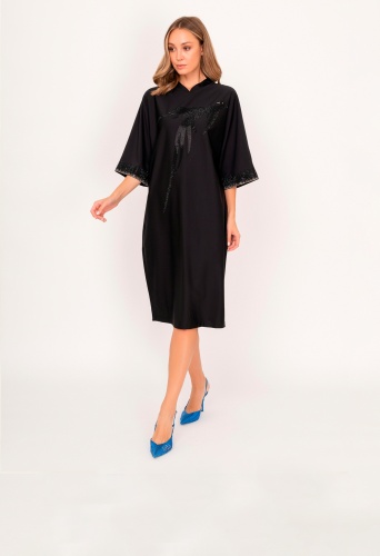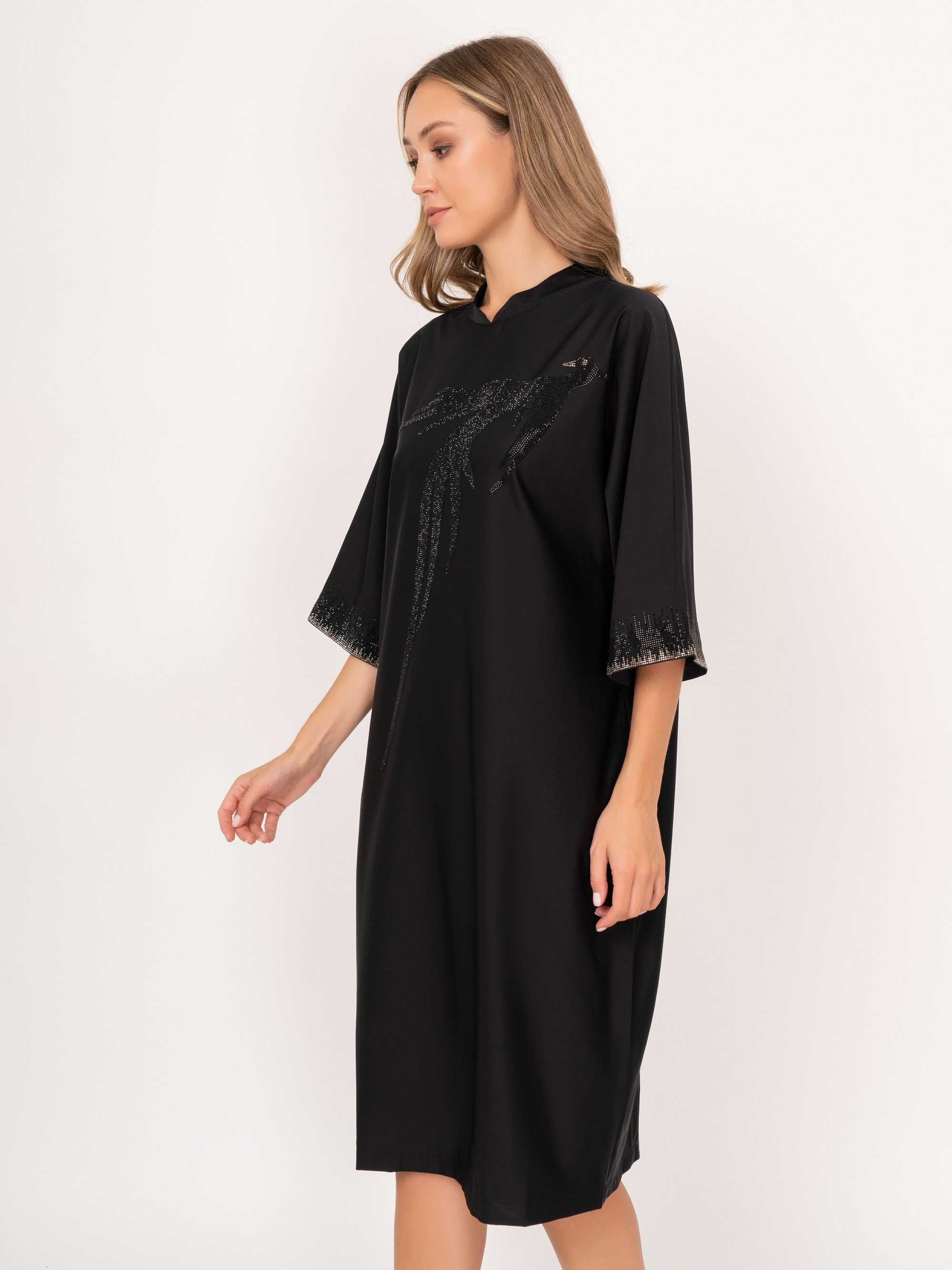 На сайте указаны российские размеры. Прямое черное миди платье с фигурным воротником, с укороченным рукавом 3/4, украшенный стразами. Платье дополняет рисунок птицы из страз. Рост модели: 175 см. Длина платья: 106 см.