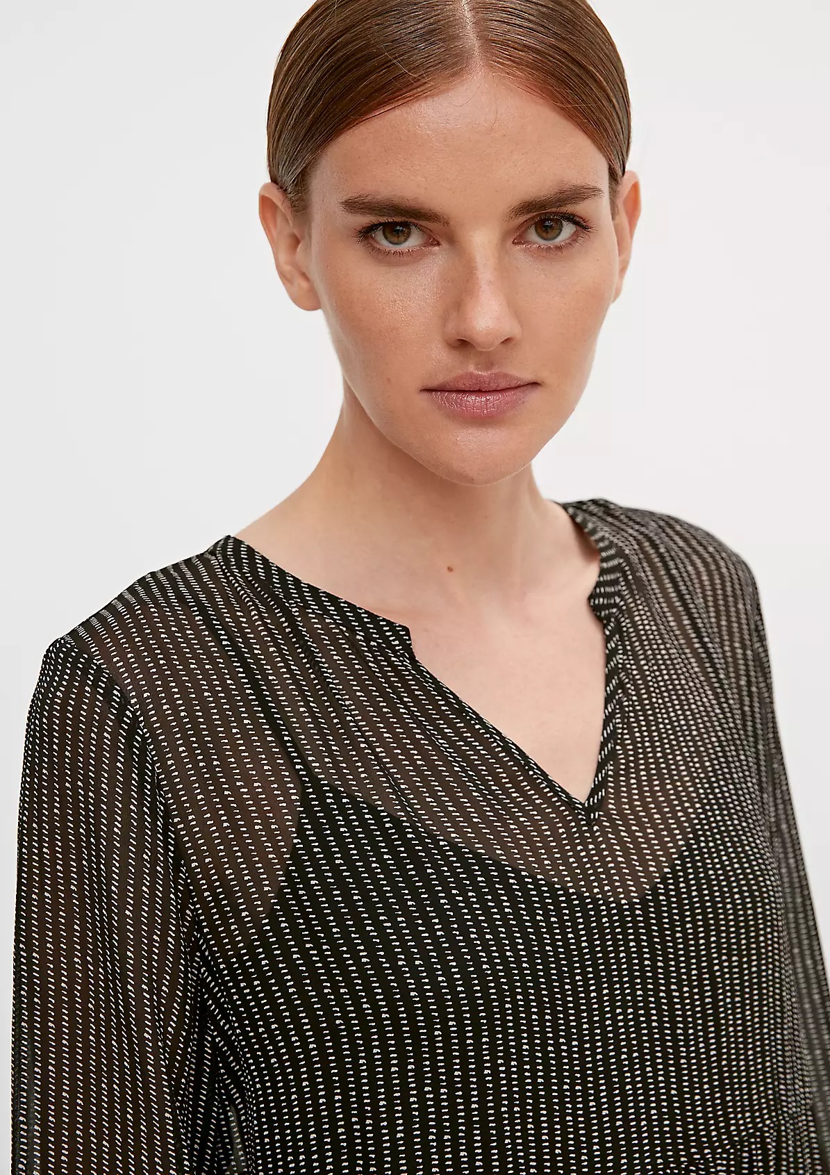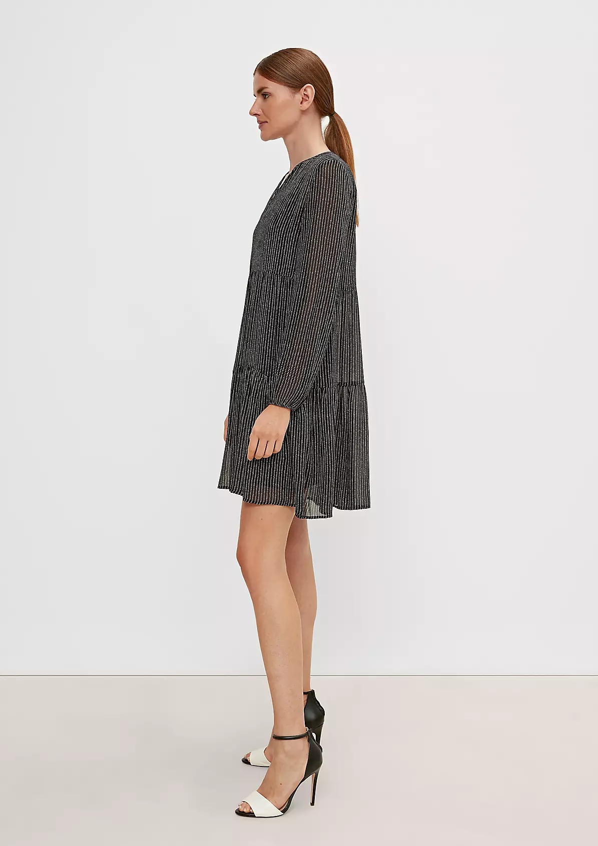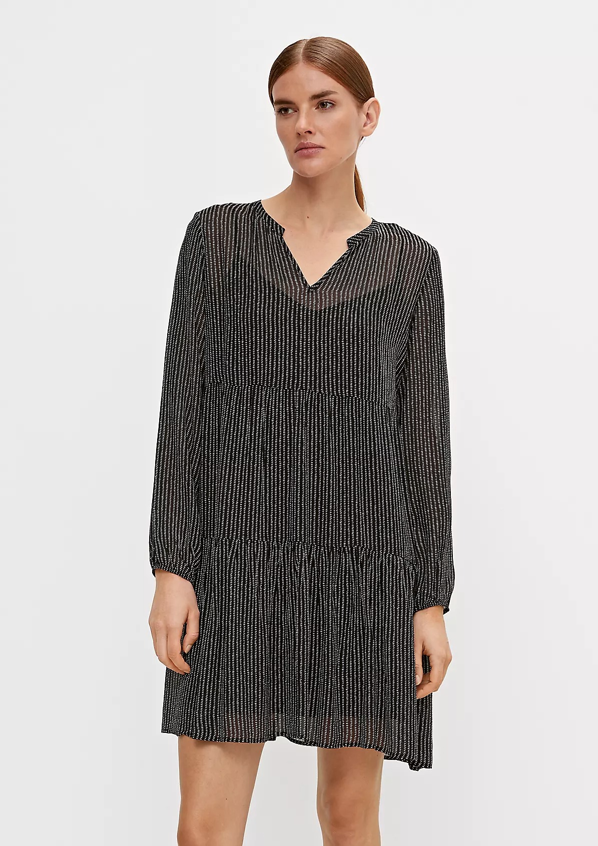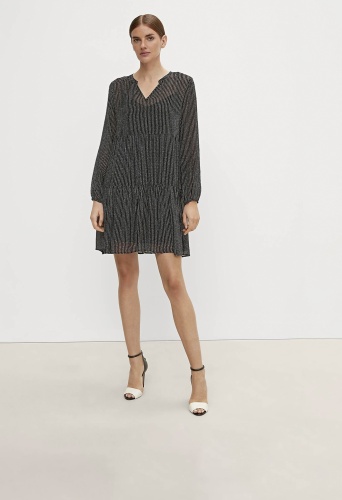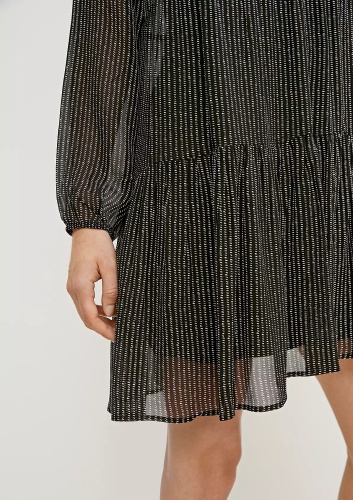 На сайте указаны российские размеры. Полупрозрачное платье прямого кроя с длинными рукавами и эластичными манжетами. Длина спинки в 44 размере - 97 см.