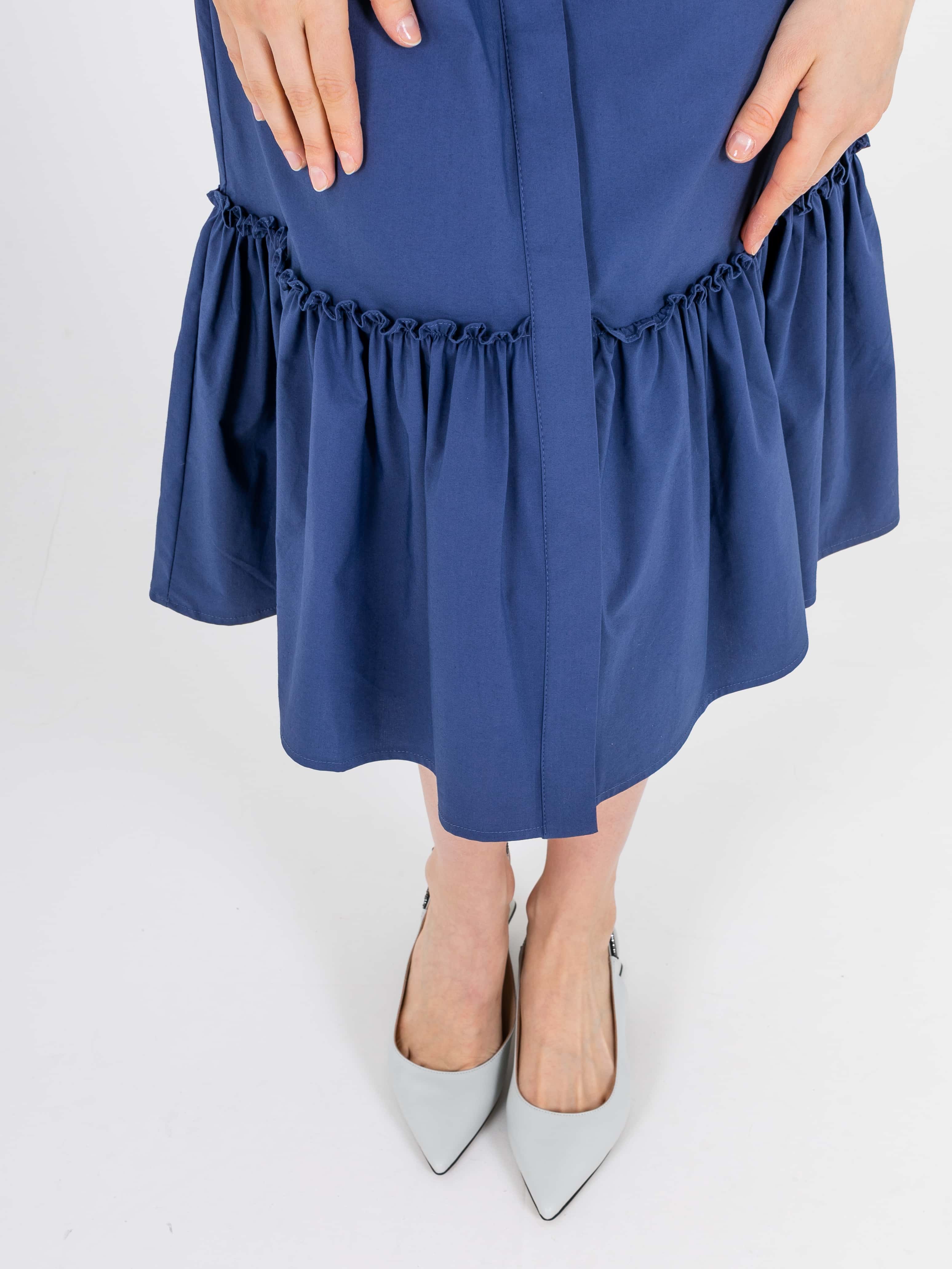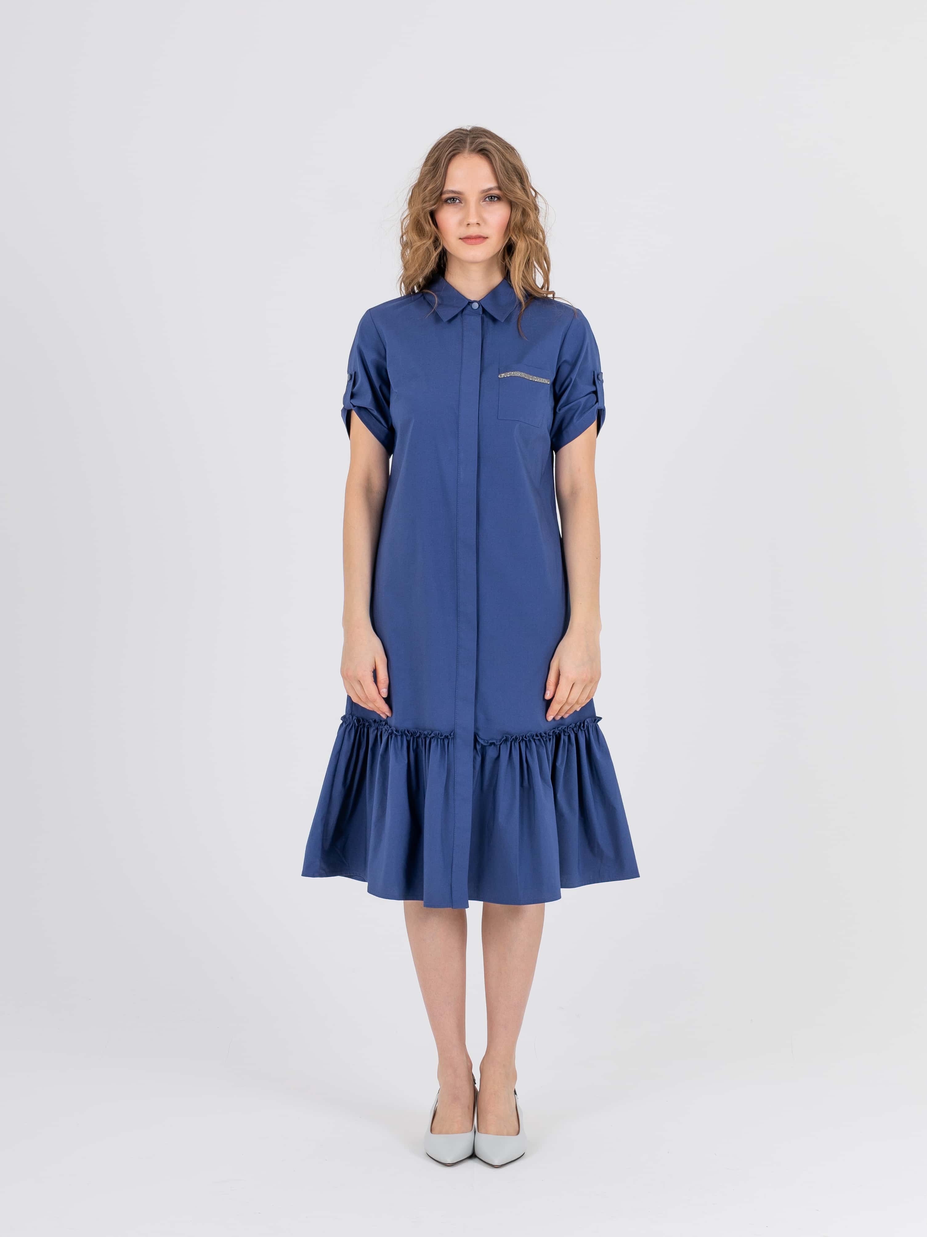 На сайте указаны российские размеры. Платье-рубашка А-силуэта длиной midi с оборкой по низу. Перед с двумя вытачками на выпуклость груди, идущими из боковых швов. Застежка потайная на 10 пуговиц. Также в области груди располагается накладной карман с декоративной аппликацией из страз. Укороченные рукава с патами на пуговицах. Стояче-отложной воротник.