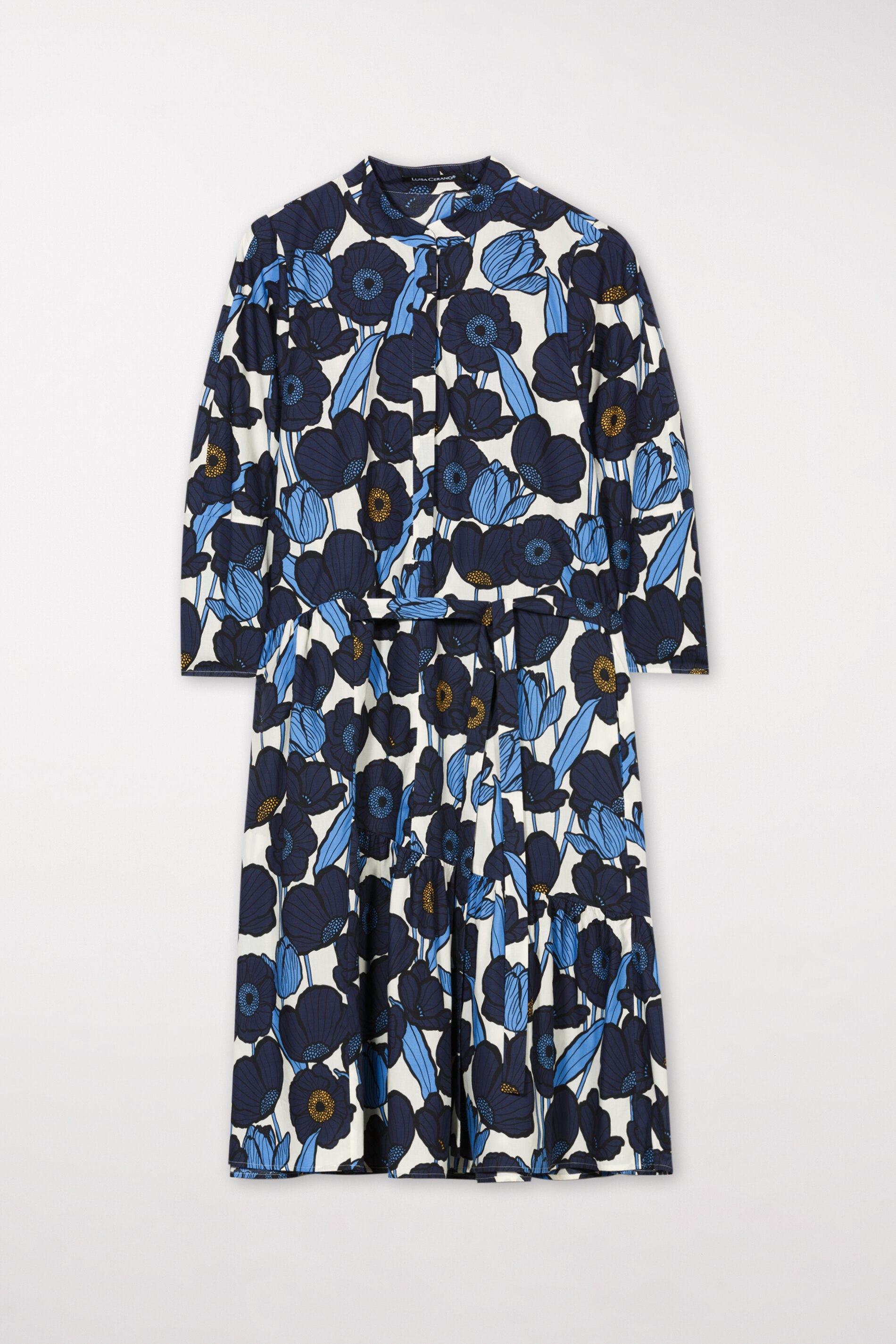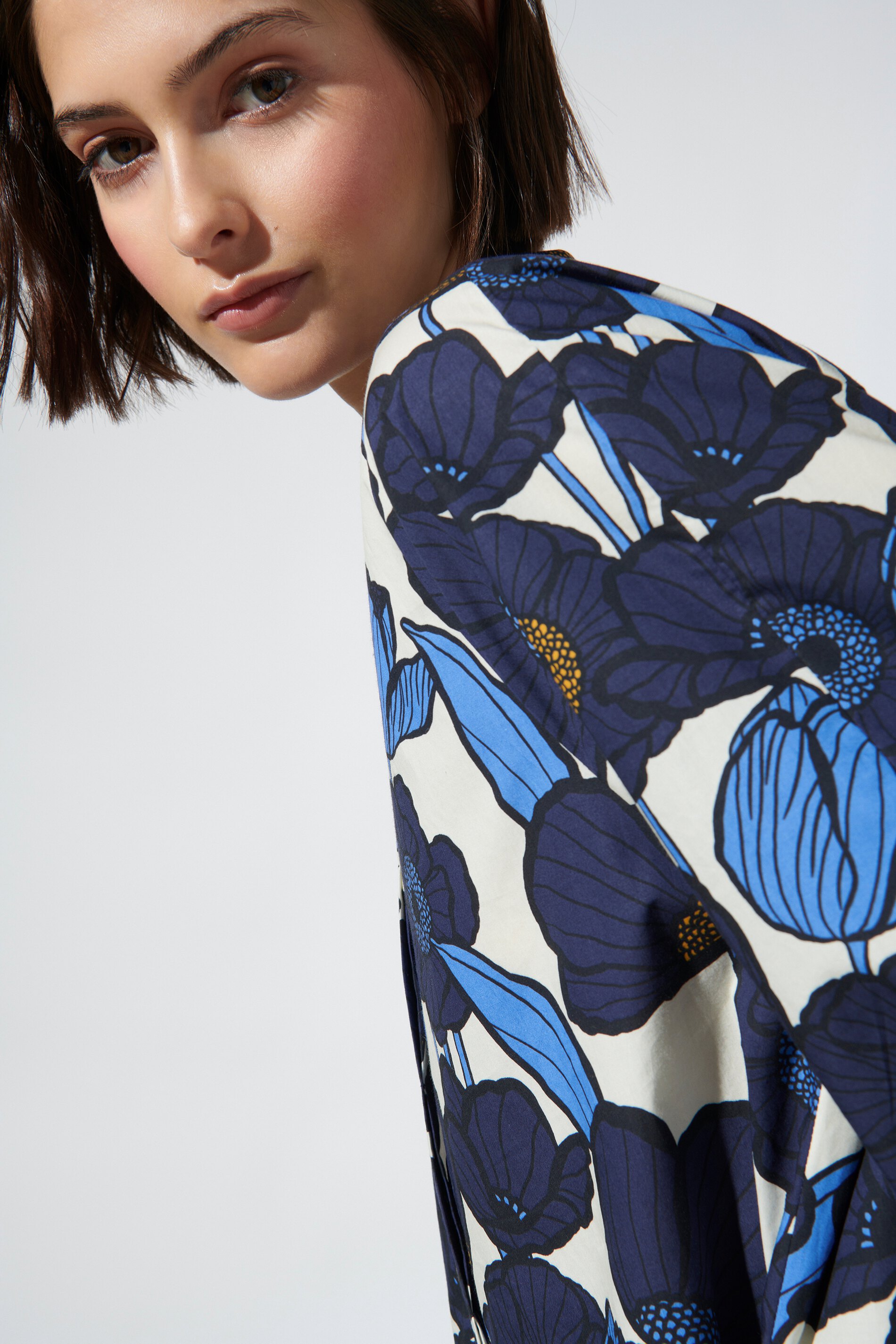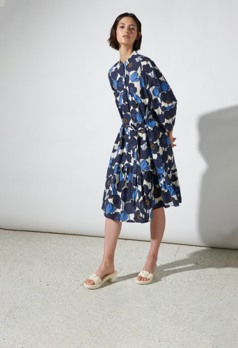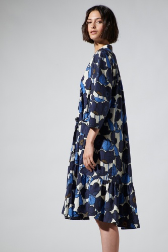 На сайте указаны российские размеры. Женственное платье-рубашка с эксклюзивным абстрактным принтом в виде маков на хлопковом поплине, асимметричного кроя, с рукавами средней длины и поясом средней длины с потайной пуговицей. Талию можно подчеркнуть двумя поясными завязками. Рост модели 178 см