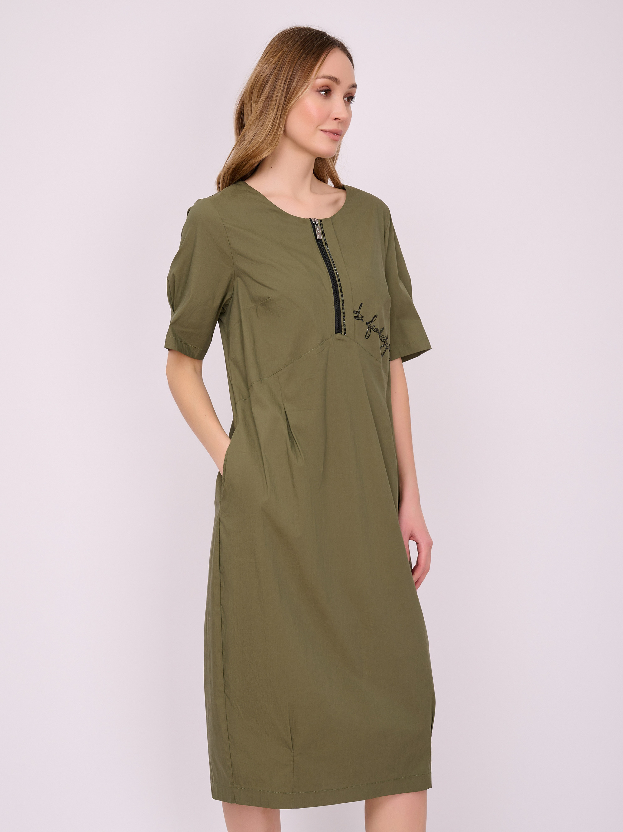 На сайте указаны российские размеры. Платье средней длины на молнии с округлой горловиной, короткими рукавами, кокеткой и юбкой «тюльпан». Украшено надписью со стразами. Длина по спинке: 110 см. Рост модели 175 см.
