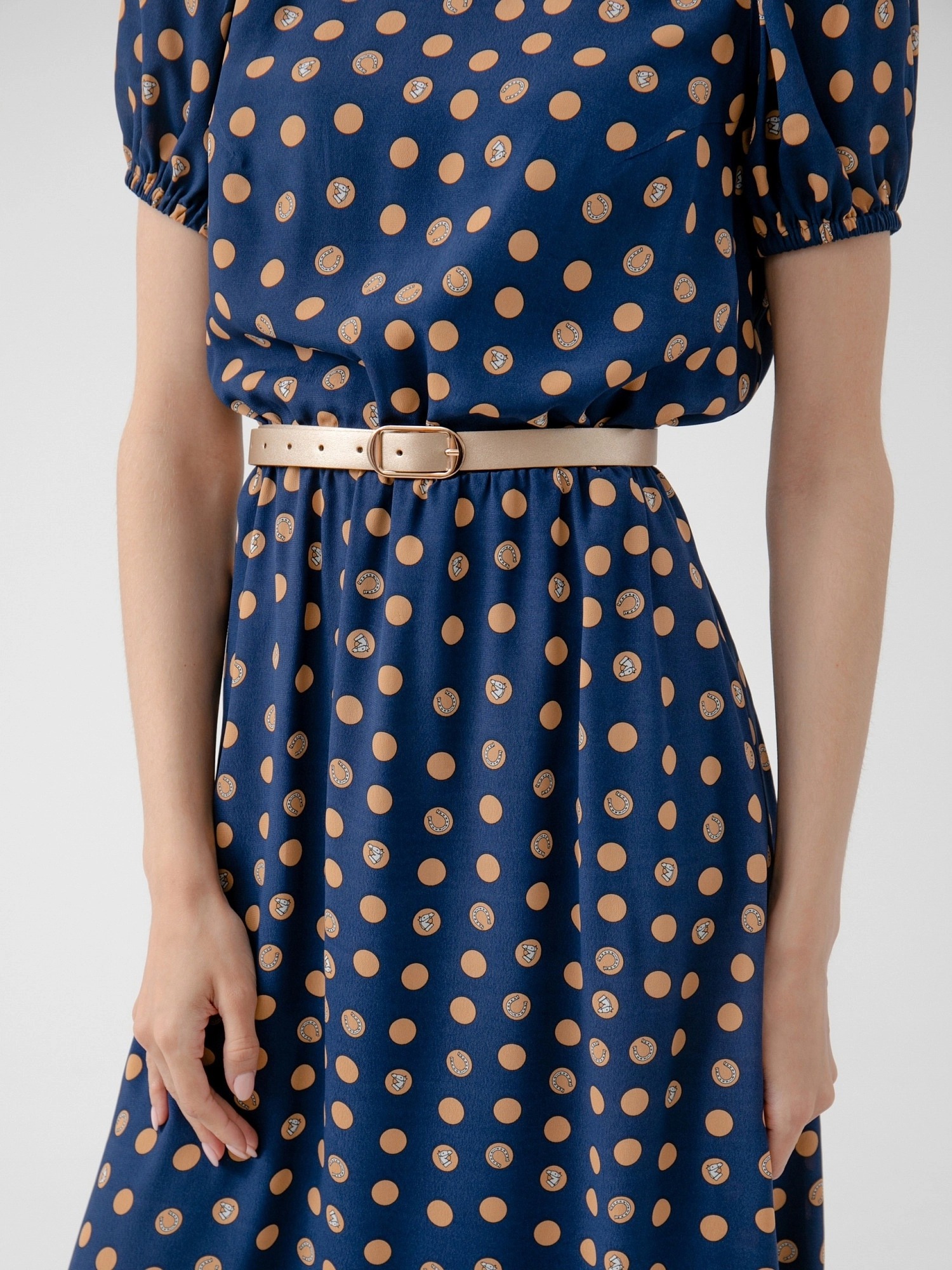 Приталенное платье из вискозной ткани с принтом с юбкой полусолнце. Платье с небольшим втачным рукавом на резинке и круглой горловиной. В комплект входит тонкий пояс из экокожи цвета охры.