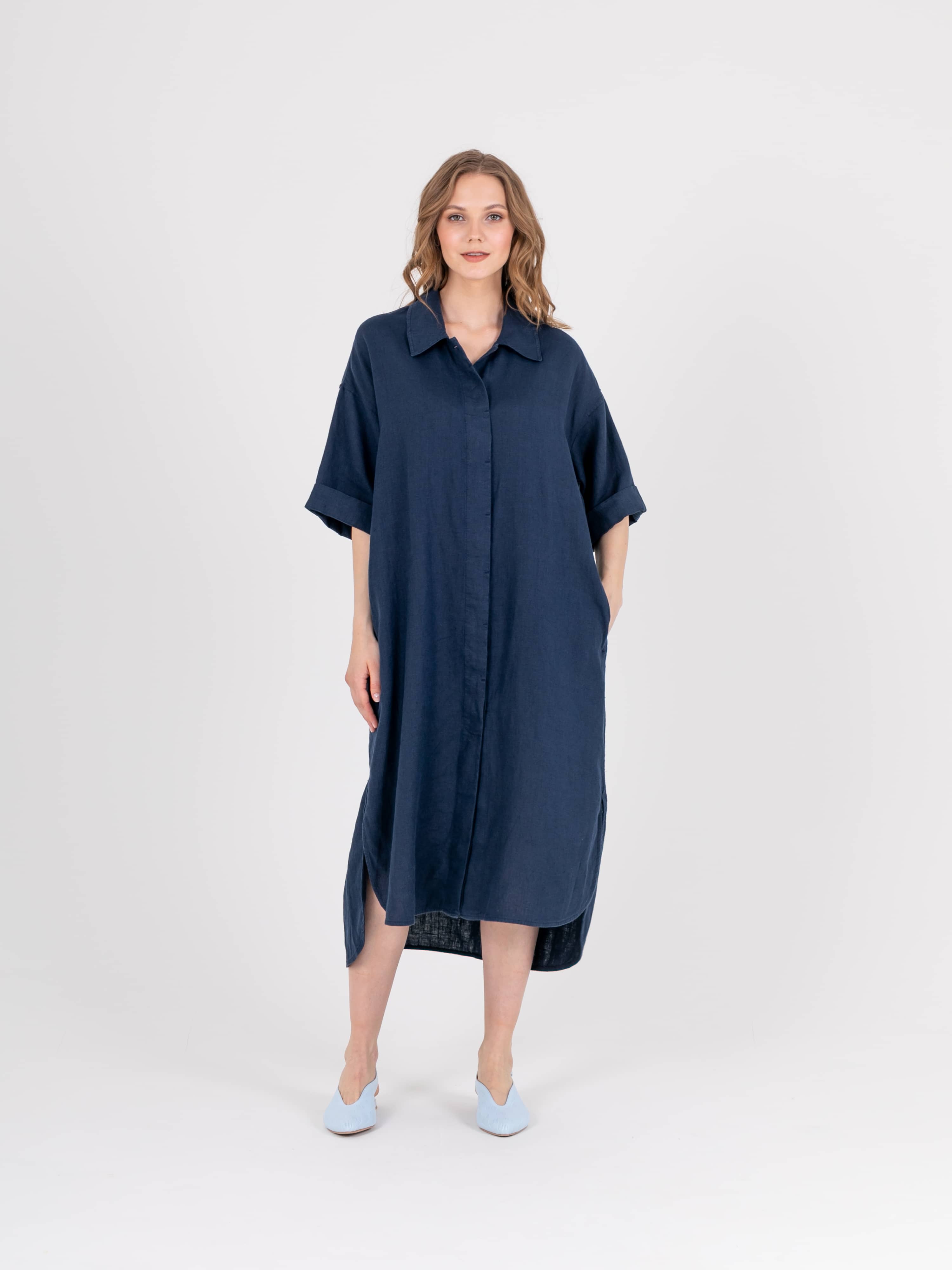 Платье-рубашка прямого силуэта длиной midi из натурального льна с потайной застежкой на 10 прорезных петель и пуговиц, с разрезами в боковых швах и съемным поясом. На спинке прямая кокетка. Укороченные цельнокроеные рукава со спущенной линией плеча. Стояче-отложной воротник.