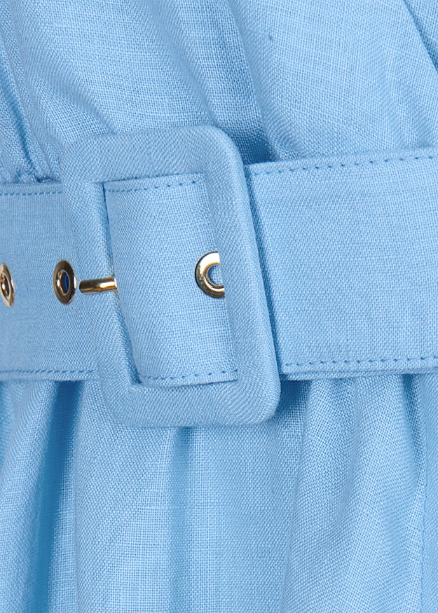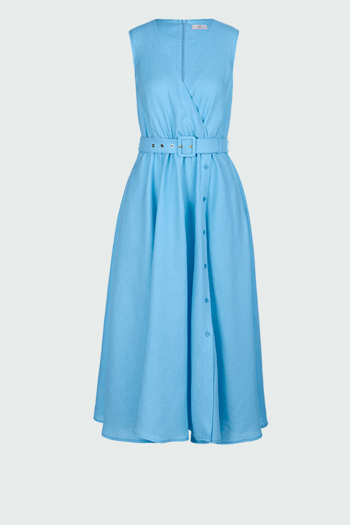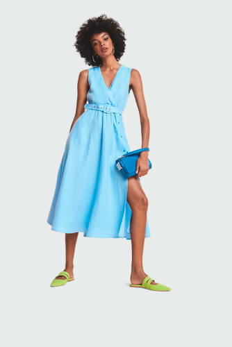 Платье миди без рукавов из льна с запахом, V-образным вырезом и поясом. Еще одна оригинальная деталь — дерзкий разрез на платье, который можно застегивать и расстегивать в зависимости от настроения.